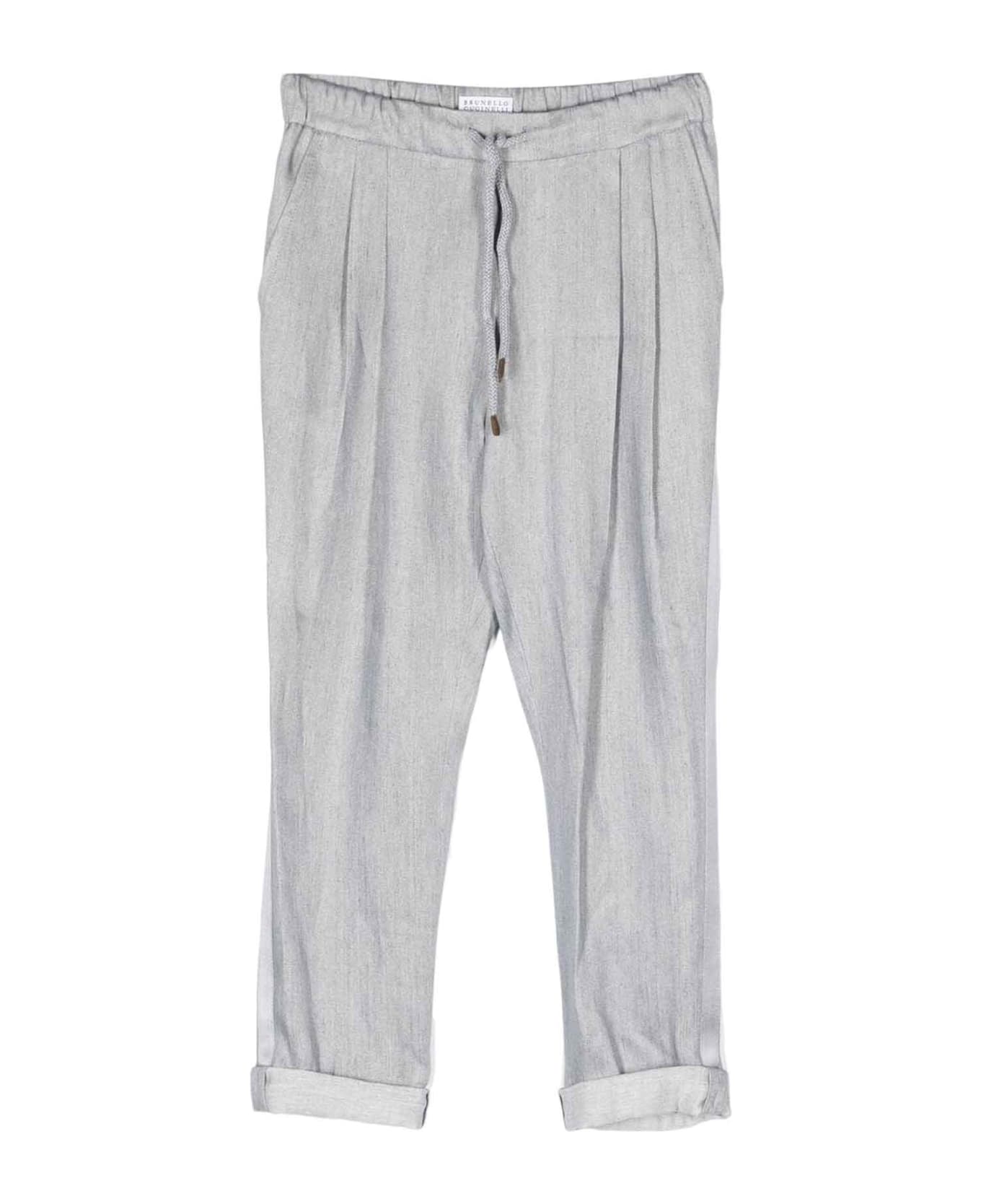 Gray trousers boy. Waist with elasticated drawstring, pleated detail, two side slanted pockets, turn-ups and two back welt pockets. Linen 100%, Cotton 50%, Silk 50%