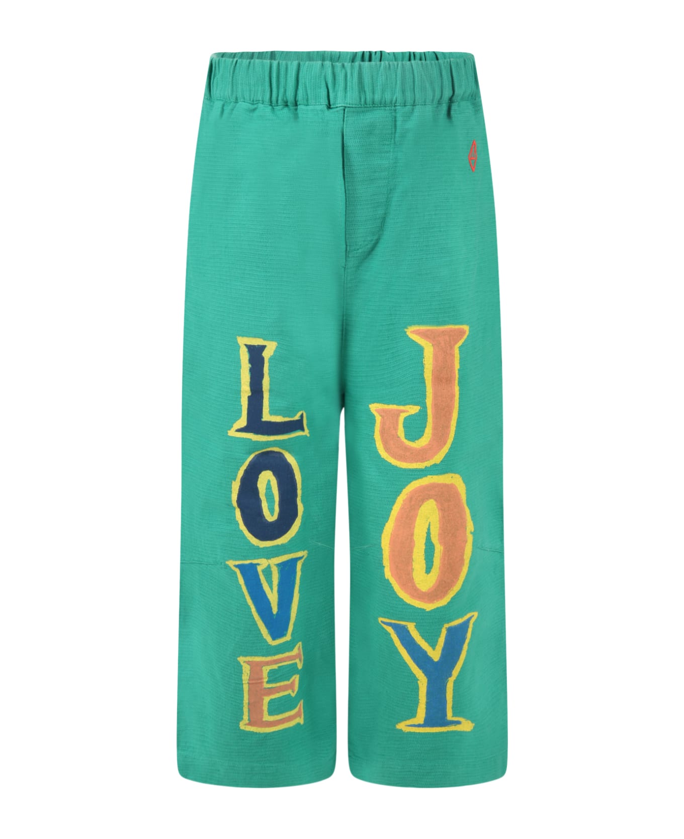 Green culotte trouser, made from cotton, with elasticized waistband and side pockets. It is embellished with colorful ''Love'' and ''Joy'' writings and red embroidered logo, on the front.