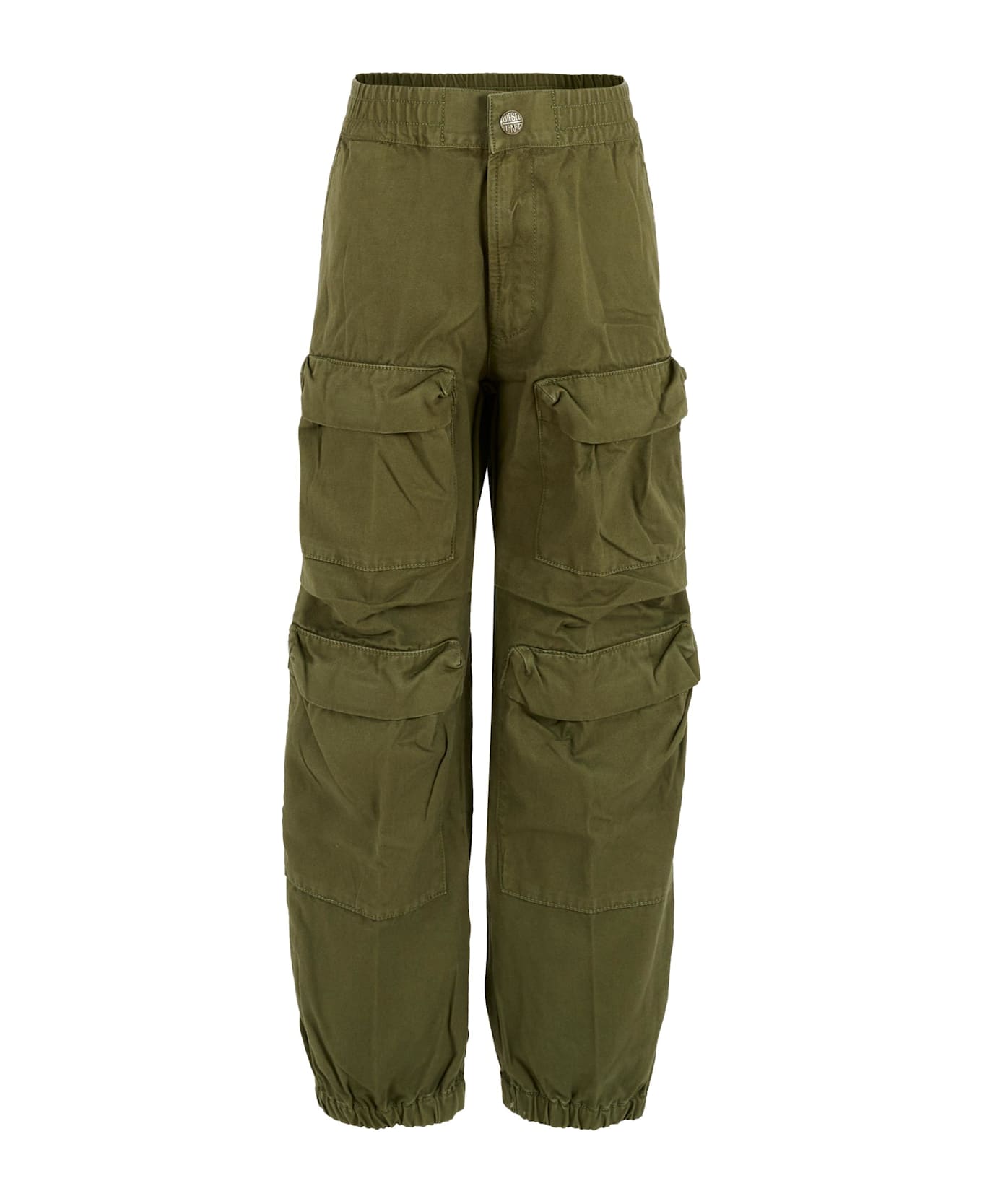 Green trousers with elasticated waistband, button and zip fastening at the front, side and back pockets, flap pockets at the front. They are embellished with a logo on the back.