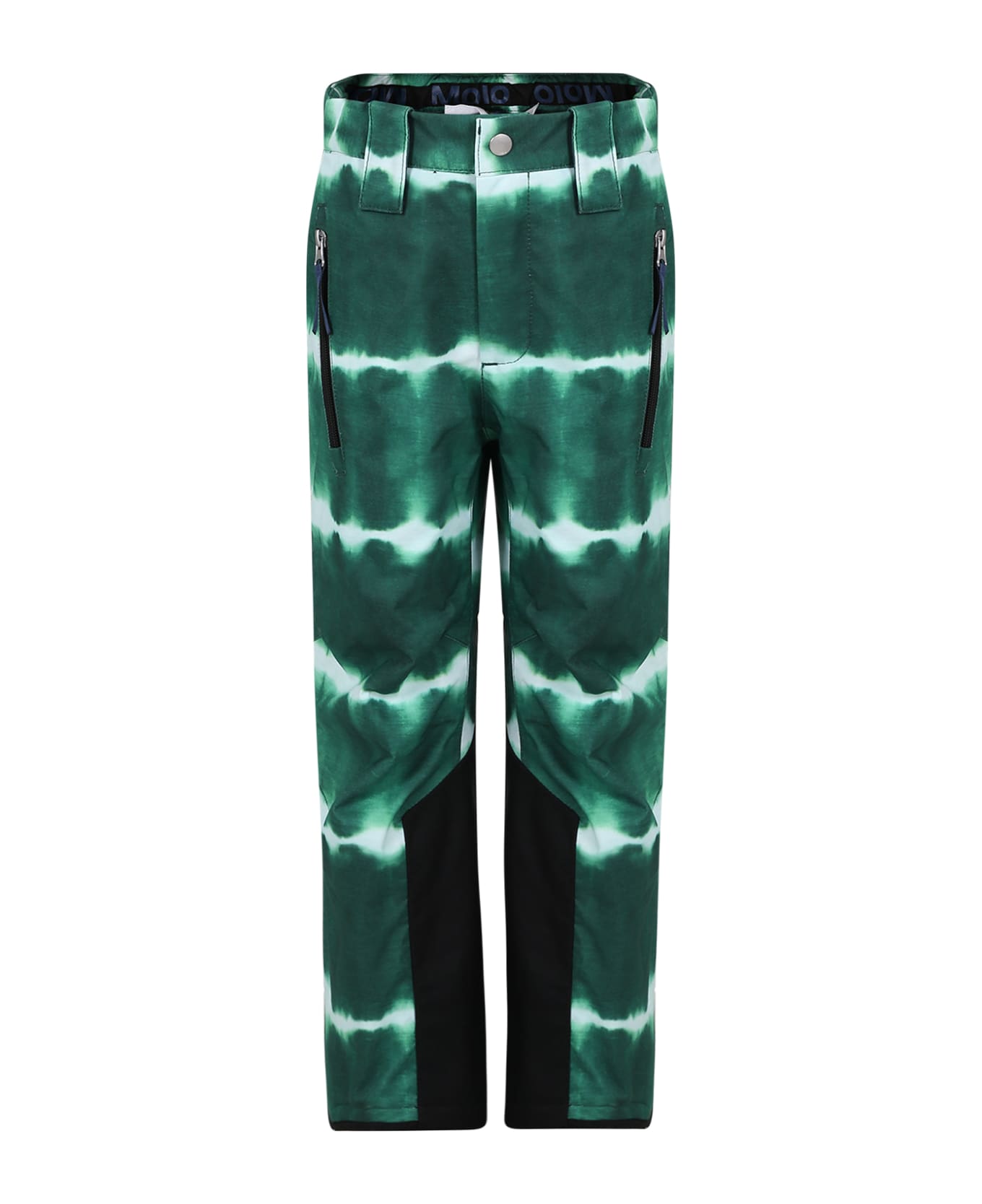 Green trousers, made of recycled polyester, with belt loops, front closure with zip and automatic button, adjustable waist thanks to internal elastic bands with button, side pockets with zip, elasticated ankles with adjustable strap and velcro closure, equipped with fastening. They are embellishted with tie-dye print and logo patch on the side.
