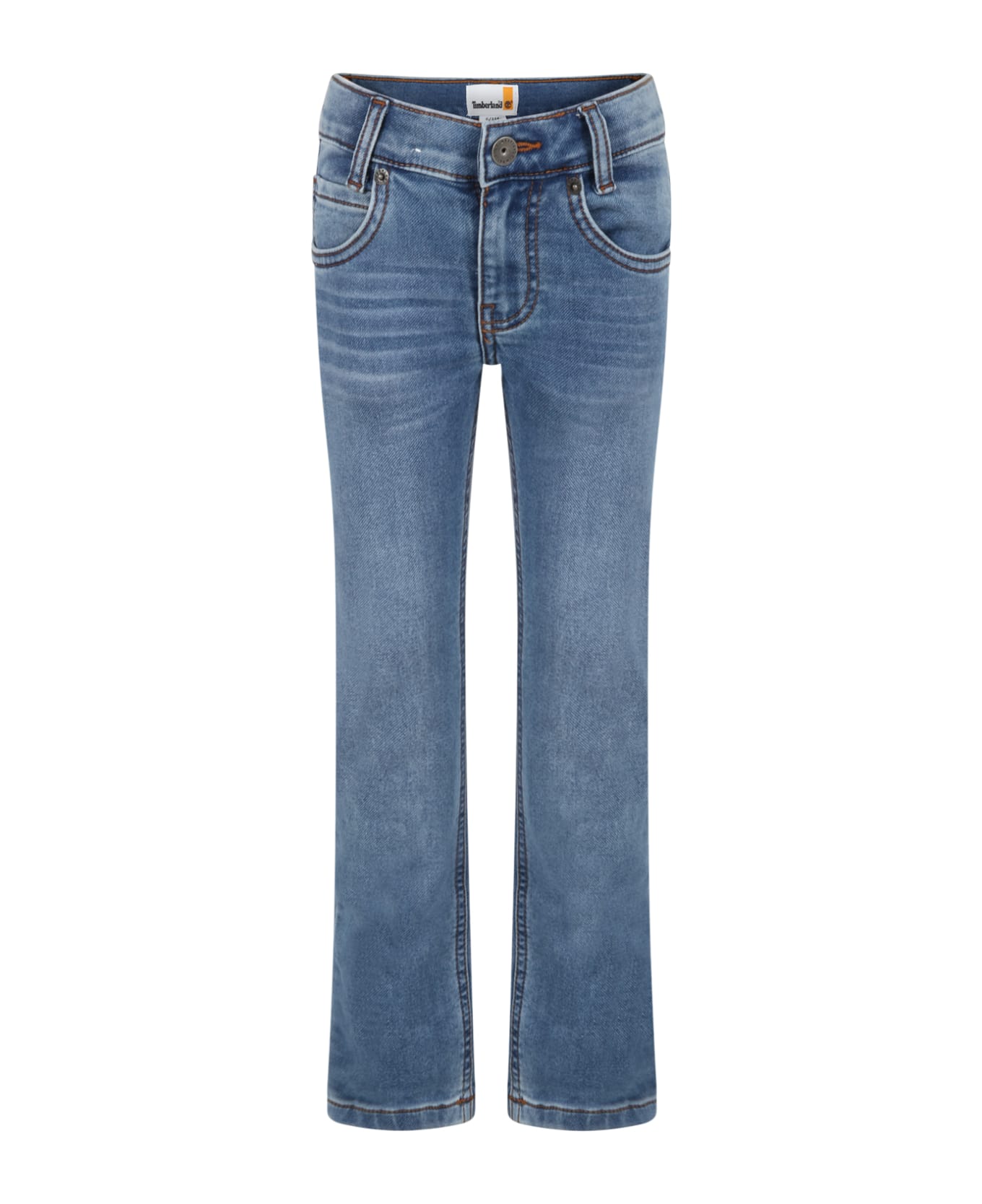 Light blue five pocket jeans in cotton, with adjustable waist thanks to the internal elastic bands with button, belt loops and button and zip closure on the front. They are embellished with logoed patch on the back.