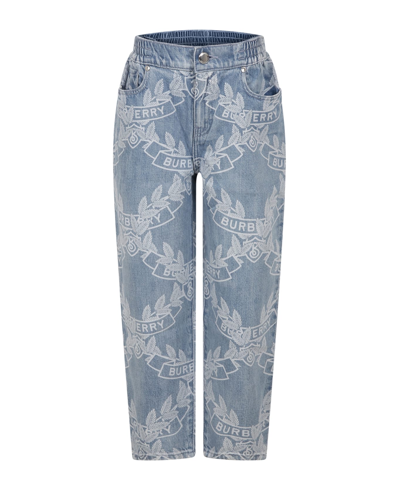 Light blue denim jeans, five pockets, with elastic waistband, zip and button closure on the front. They are embellished with all-over iconic logo.