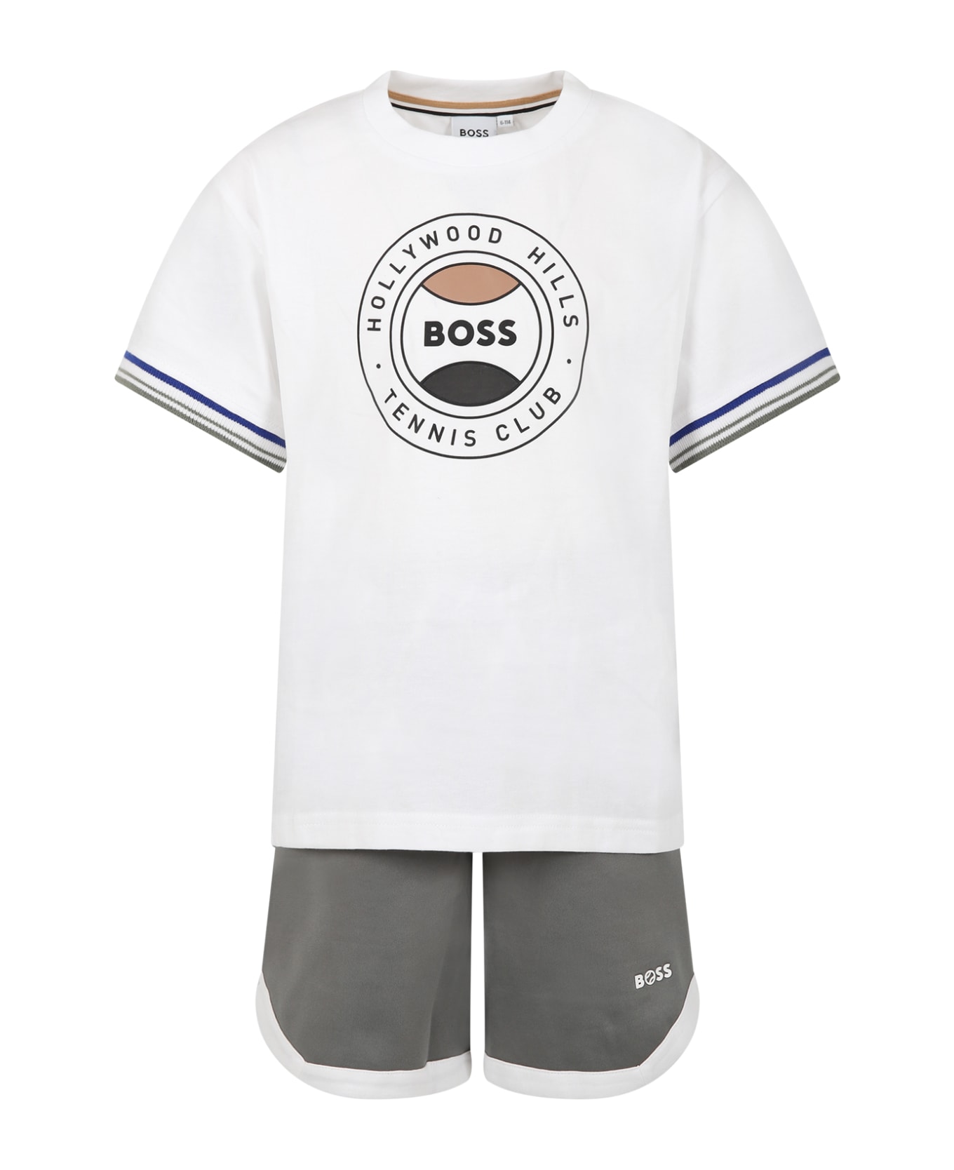 White and green suit, composed of t-shirt and shorts; t-shirt with short sleeves and ribbed crew neck. It is embellished with rubber logo on the front, blue and green details on the sleeves. Shorts with elastic and drawstring waist, side pockets. They are embellished with logo on the bottom.