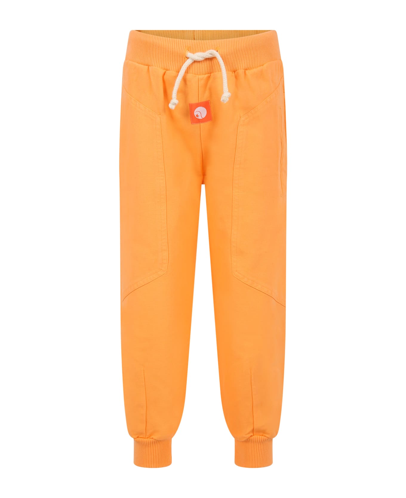 Orange trousers, in organic cotton, with elastic waistband and drawstring, side pockets, ribbed hems. They are embellished with patches on the front.
