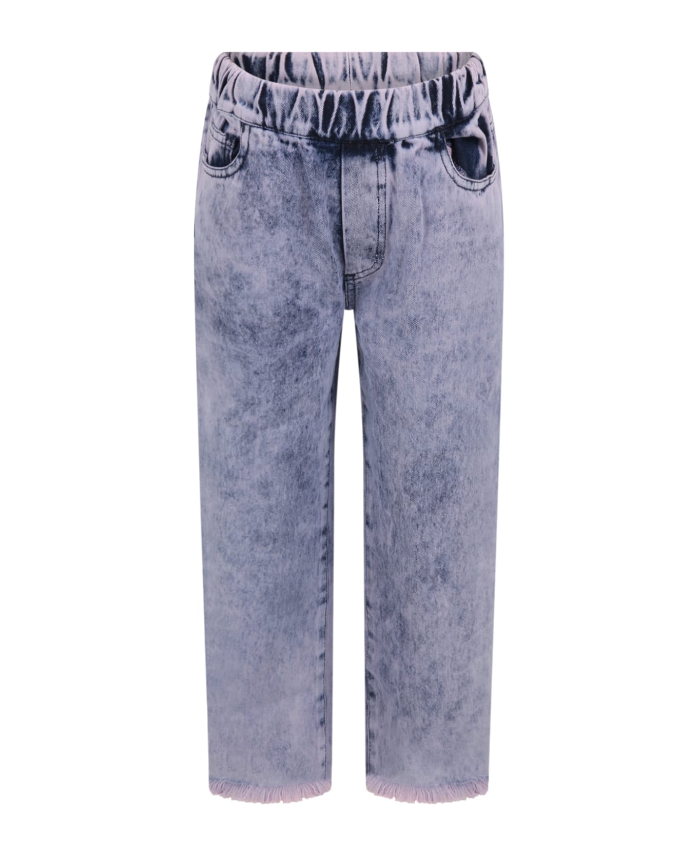 Denim purple jeans, with elasticized waistband, back pockets and side pockets. It is embellished with frayed edges.