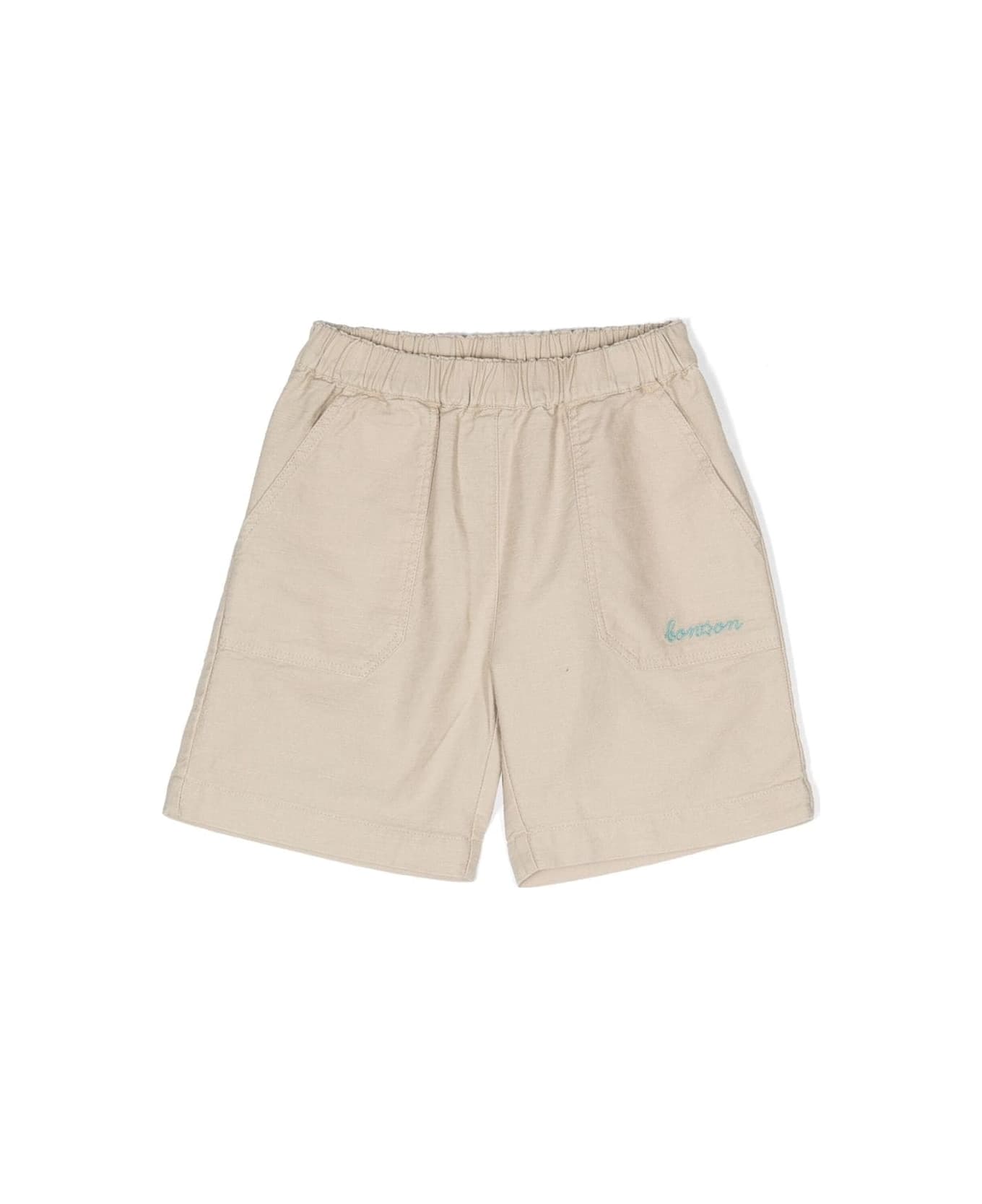 Beige, cotton blend, embroidered logo, side pockets and back pocket. Composition