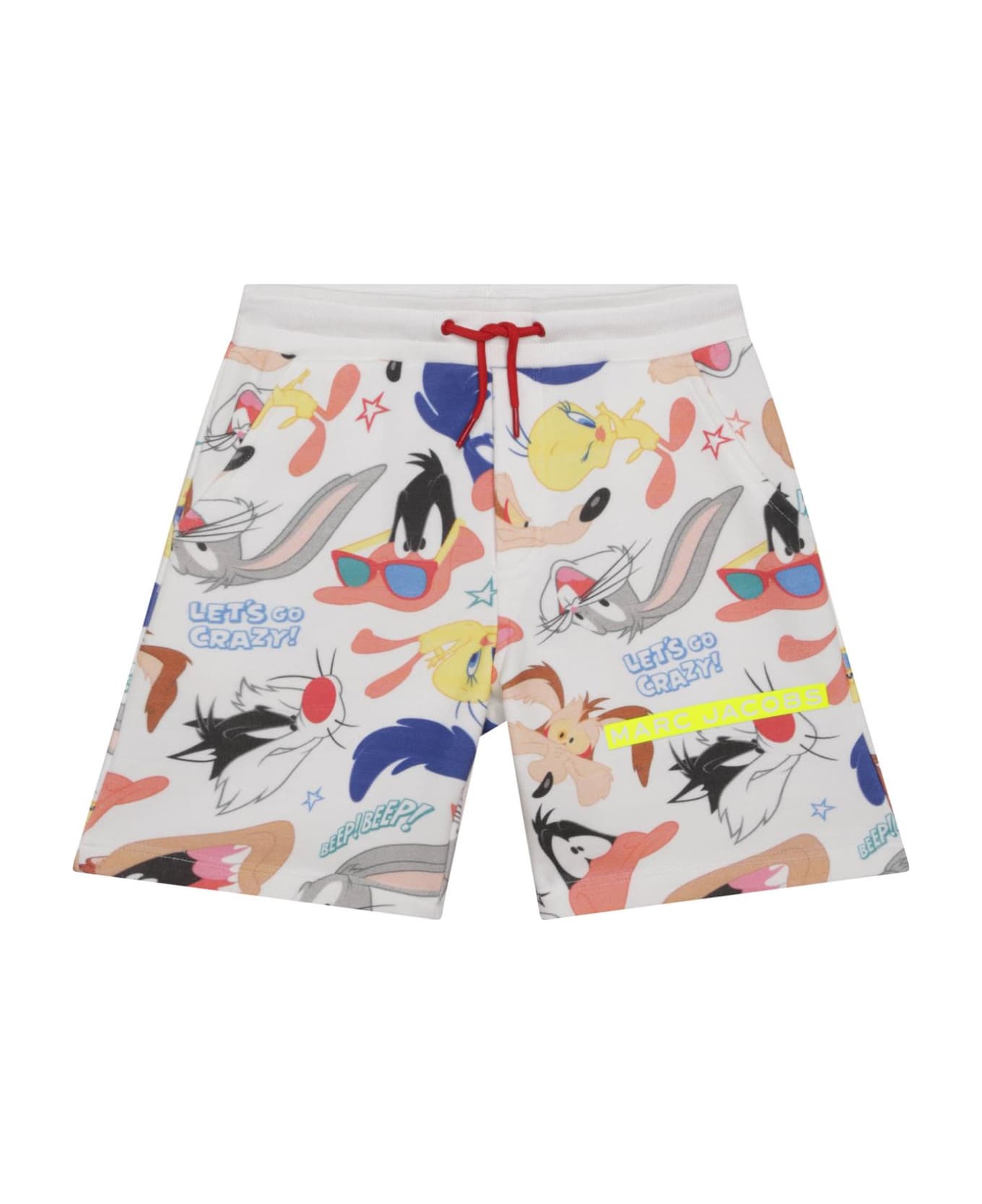 in white fleece, with all-over Looney Tunes print, yellow contrasting logo and drawstring at the waist. 100% cotton