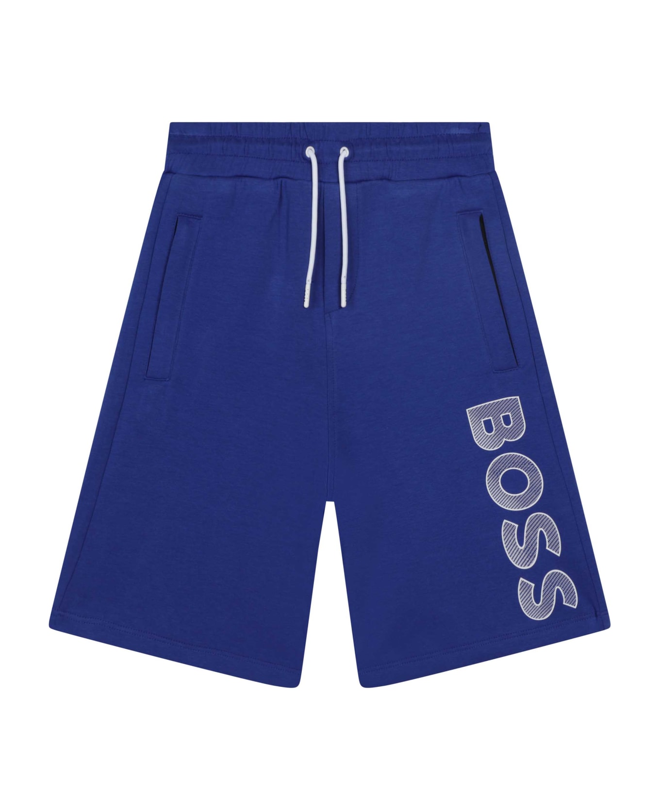 Royal blue, cotton blend, jersey knit, logo print on leg, elasticated drawstring waist, two side welt pockets and above knee height. Composition Outer: Cotton 78%, Polyester 15%, Elastane 7% Lining: Cotton 100%