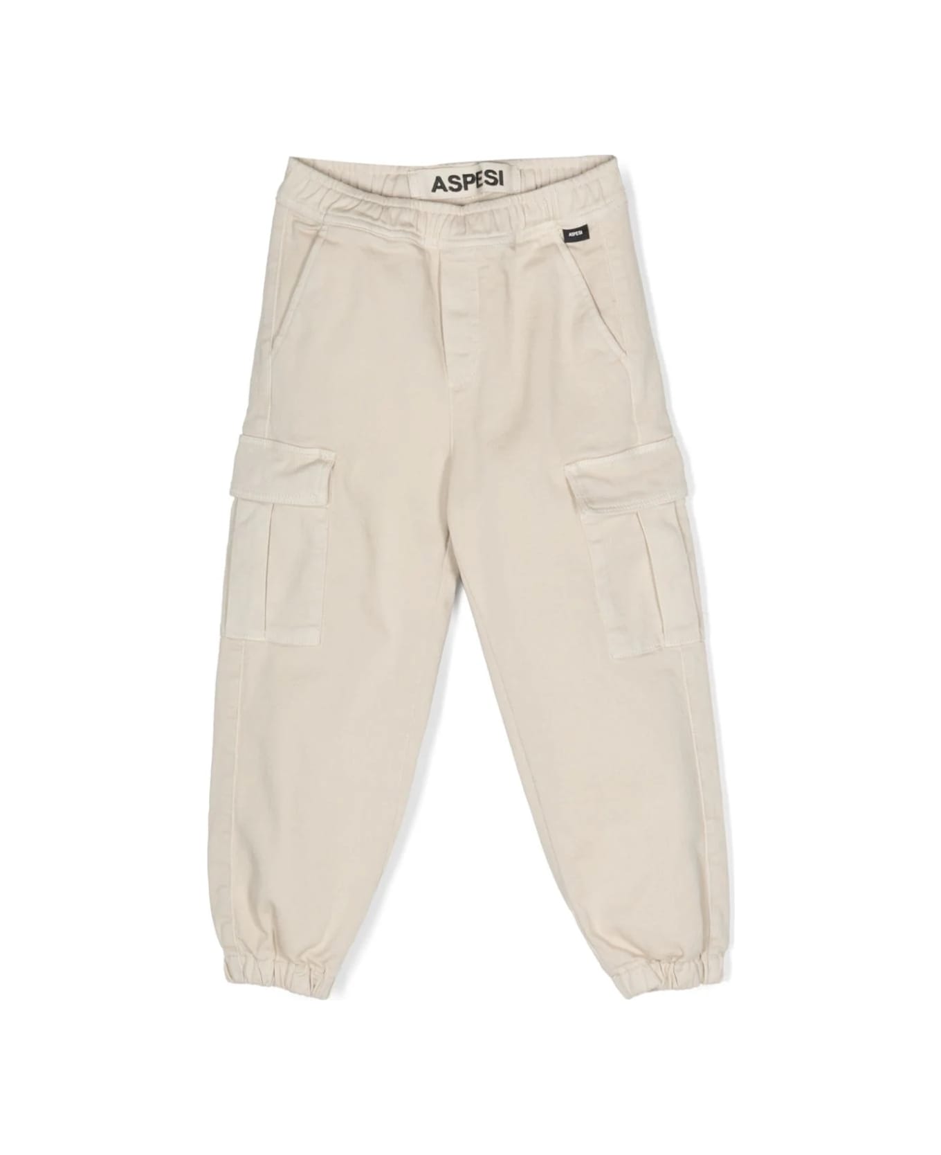 Light beige, cotton, elasticated waist, bellows pockets on the sides, two side pockets with flap, back welt pocket and elasticated ankle hems. Composition Lining: 100% Cotton Exterior: Cotton 98%, Elastane 2%