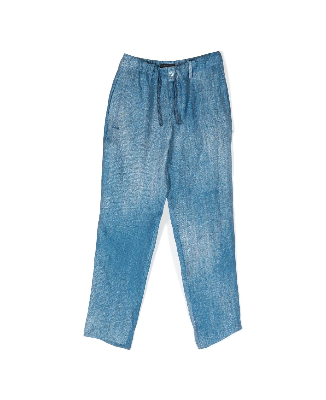 Blue, linen, denim with faded effect, waist with elasticated drawstring, front closure with buttons and zip, two side welt pockets and two back welt pockets. Origin: Italy Composition 100% linen