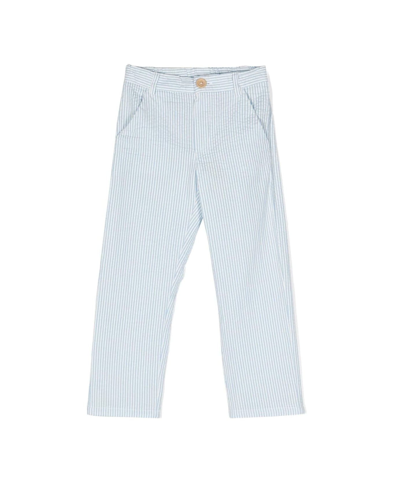 Light blue, white, colorful striped pattern, cotton, belt loops, elasticated waist, two side welt pockets, embroidered logo, button fastening and straight fit. Composition