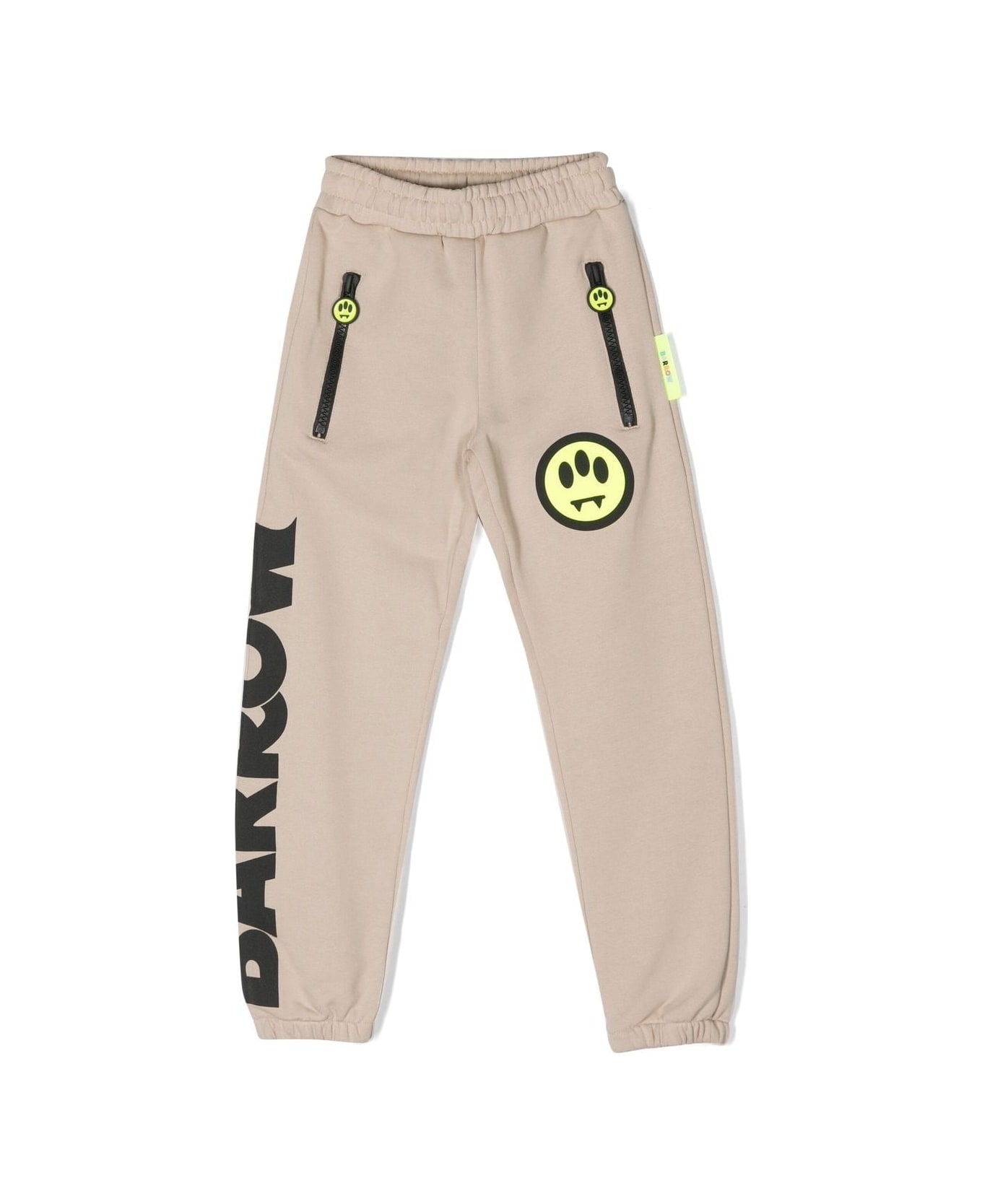 Sand colour, cotton, side print with logo, smile print, elasticated waist, two side pockets with zip and elasticated ankle cuffs. Composition 100% Cotton