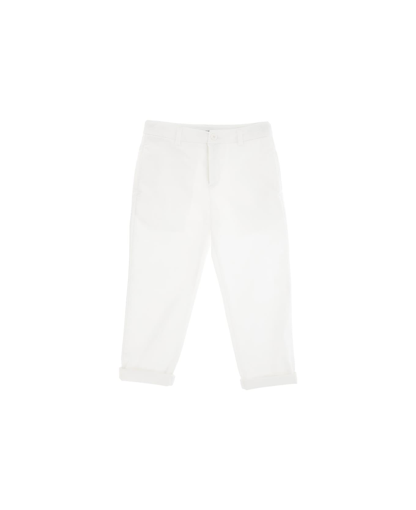 Dondup Junior straight-leg trousers in white chino fabric featuring a medium waist, belt loops, zip and button fly, logo appliqué, two welt pockets on the sides and a double welt pocket on the back.