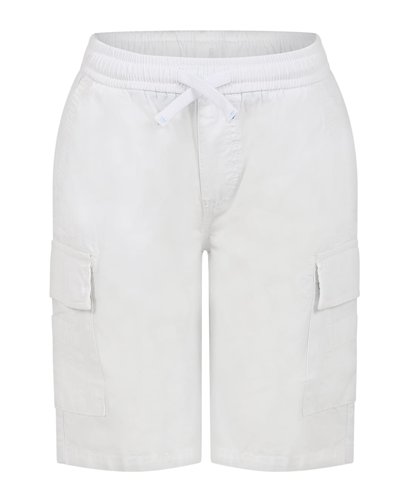 White shorts, with elastic waistband and drawstring, side and back pockets, large side pockets with snap buttons. They are embellished with logo patch on the back.