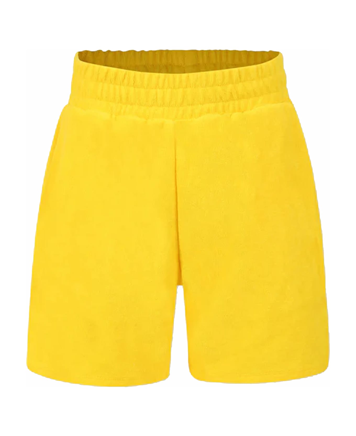 Yellow terry shorts with elastic waistband, side slits, side pockets and back pocket. They are embeellished with black embroidered logo on the back.