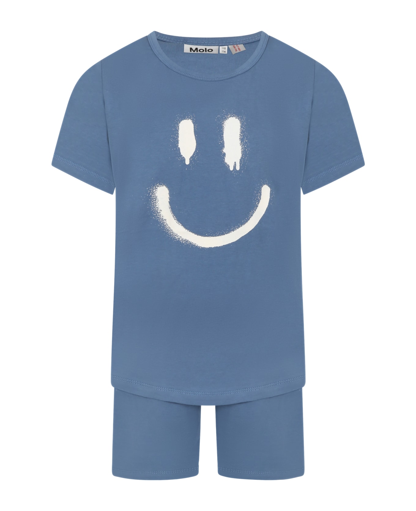 Blue pajamas in GOTS certified cotton, consisting of t-shirt and shorts. Short-sleeved T-shirt, with ribbed crew neck and hem; it is embellished with white smile on the front and logoed patch on the side. Shorts with elasticated waist band.