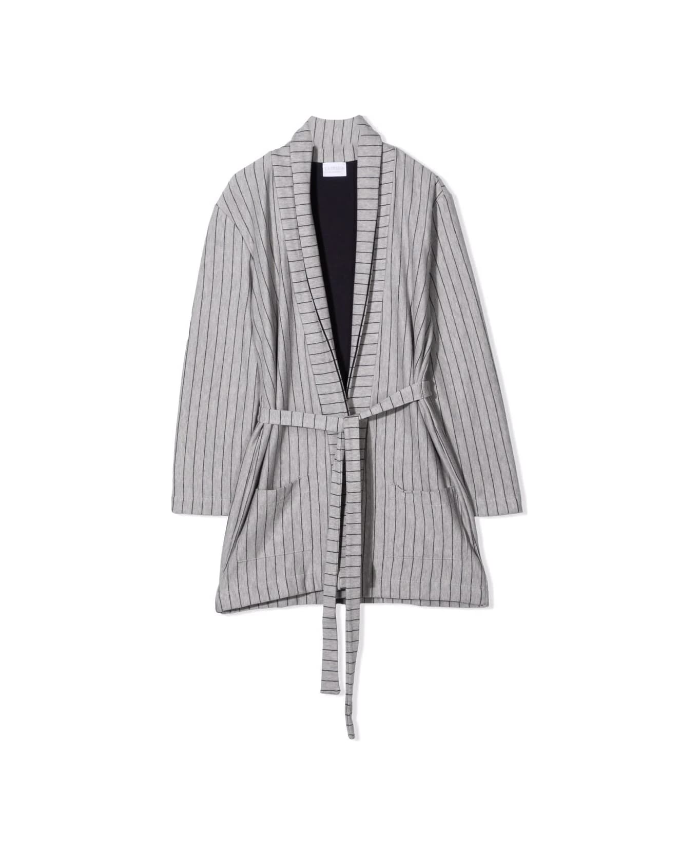Smoke-grey/black cotton striped cotton robe from LA PERLA KIDS featuring vertical stripe print, shawl lapels, tied waist, long sleeves, two front patch pockets, straight hem and mid-length. Composition: Cotone, 100%