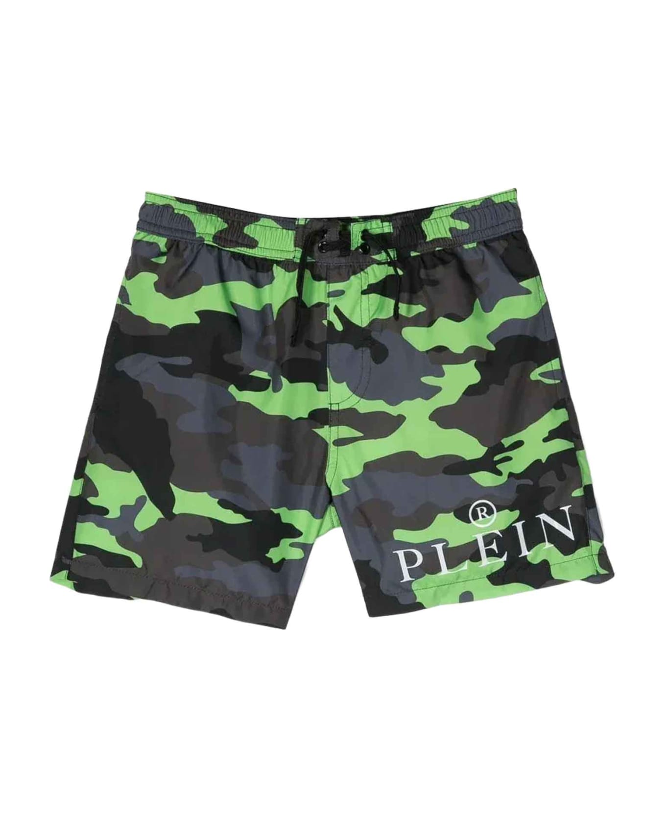 green swimsuit boy. Camouflage pattern, logo print on the front, back application with logo and elasticated drawstring waist. 100% polyester