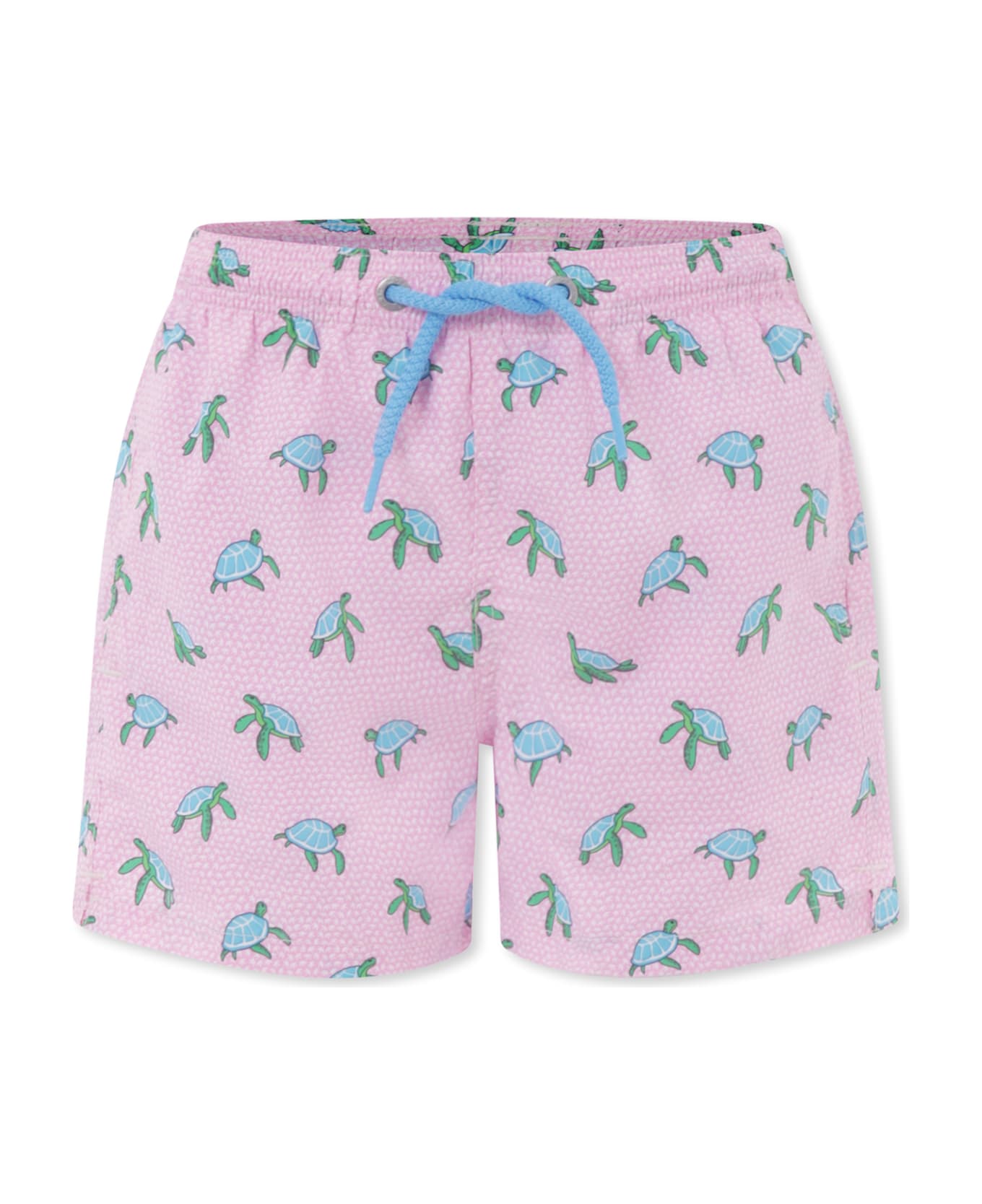 Pink recycled polyester swim shorts with elasticated waist, drawstring, side pockets and back flap pocket. They are embellished with all-over tortoise print and logo patch on the back.
