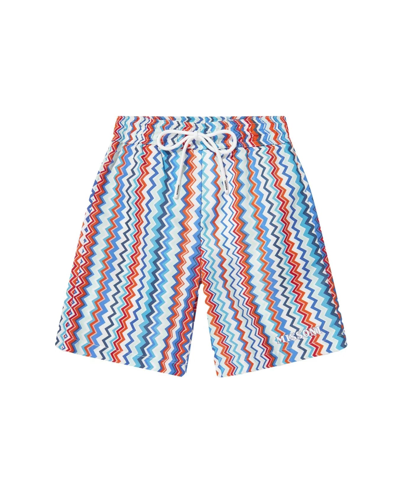 Missoni Kids swim shorts made from technical fabric with an all-over multicoloured vertical chevron pattern. The garment features an elasticated waistband with drawstring, and a contrasting Missoni logo print on the front hem.