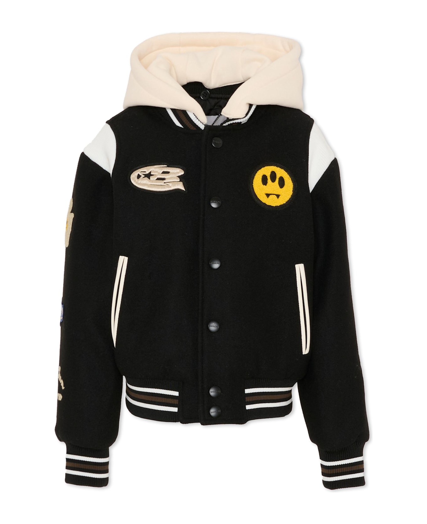Black bomber jacket with padded and quilted interior, removable hood, long sleeves, old school collar, snap button closure at the front, elasticated hem and cuffs, and faux pockets. It is embellished with all-over logo patches. It comes with a yellow logo keyring.