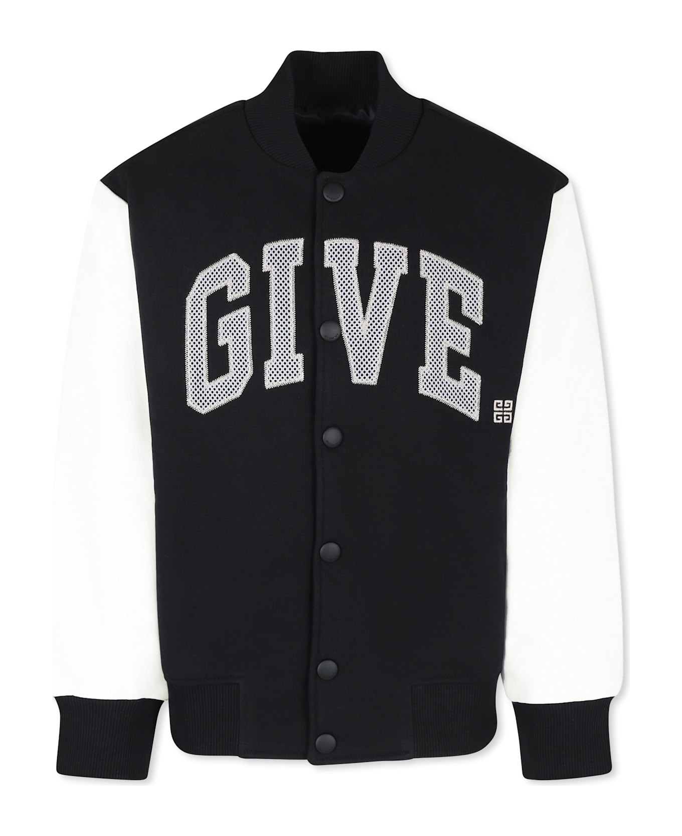 Black organic cotton blend bomber jacket with contrasting white long sleeves, low ribbed collar, front button fastening and side pockets. It is embellished with logo on the front and back.