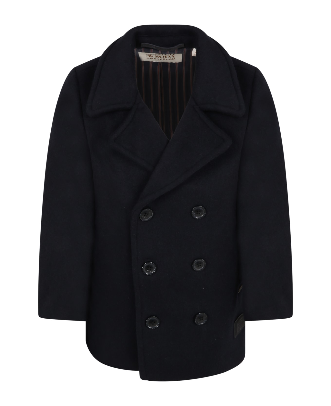 Blue double-breasted coat, with long sleeves, collar, side pockets, slit on the back and buttoned closure. It is embellished with loged patch and metallic logo, applied on the front.