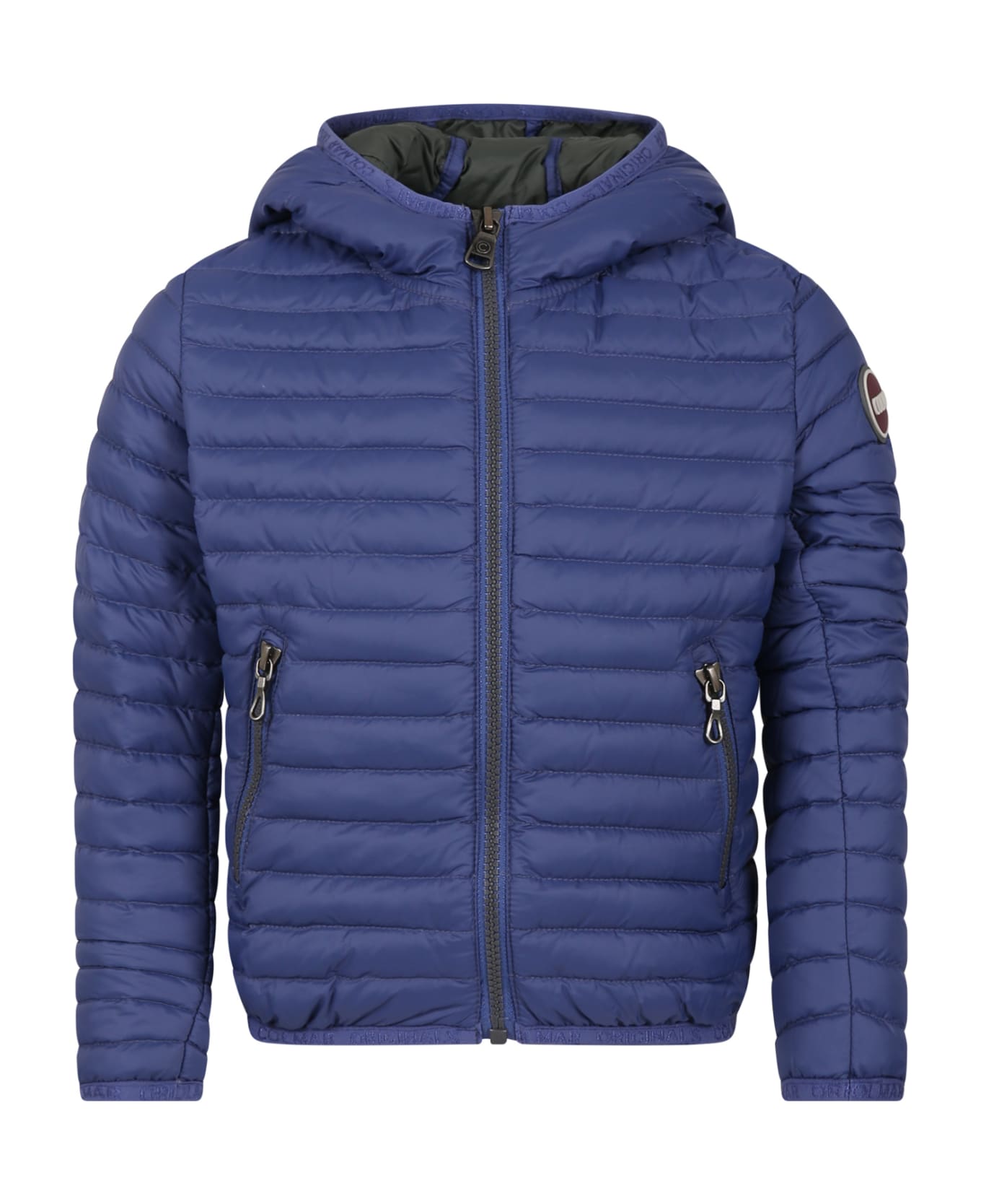 Blue quilted down jacket, with hood, soft natural feather padding, zip closure on the front and side pockets, with zip. It is embellished with iconic rubberized logo on the sleeve.
