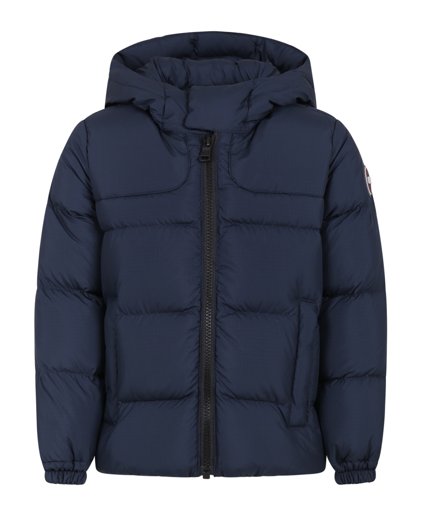 Lightly padded and quilted blue down jacket, with long sleeves, hood, front zip closure, side zip pockets, elasticated cuffs. It is embellished with the iconic rubber logo on the sleeve.