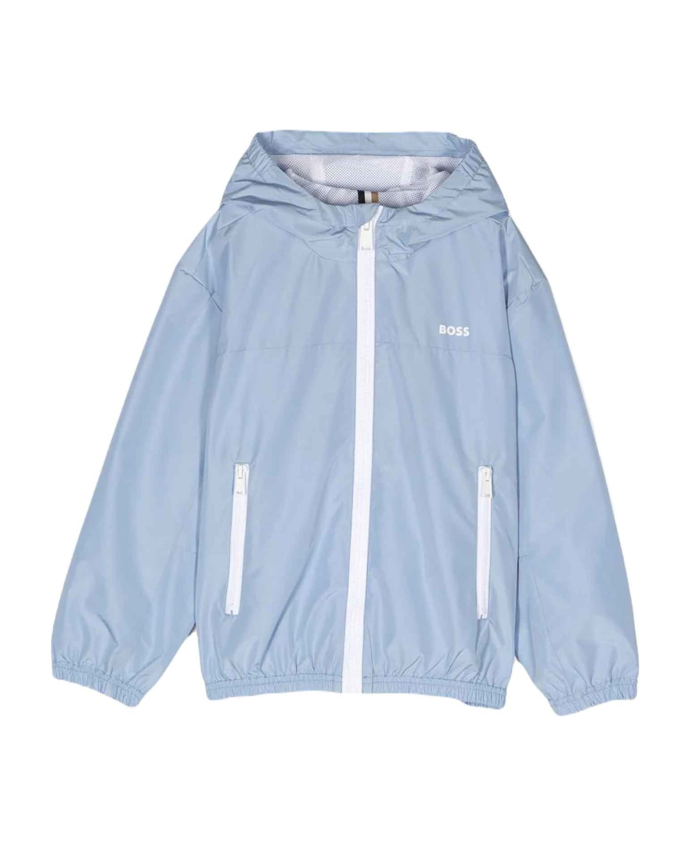 Blue jacket boy. Logo print on the front, hood, front zip closure, long sleeves and two side zip pockets. 100% polyester