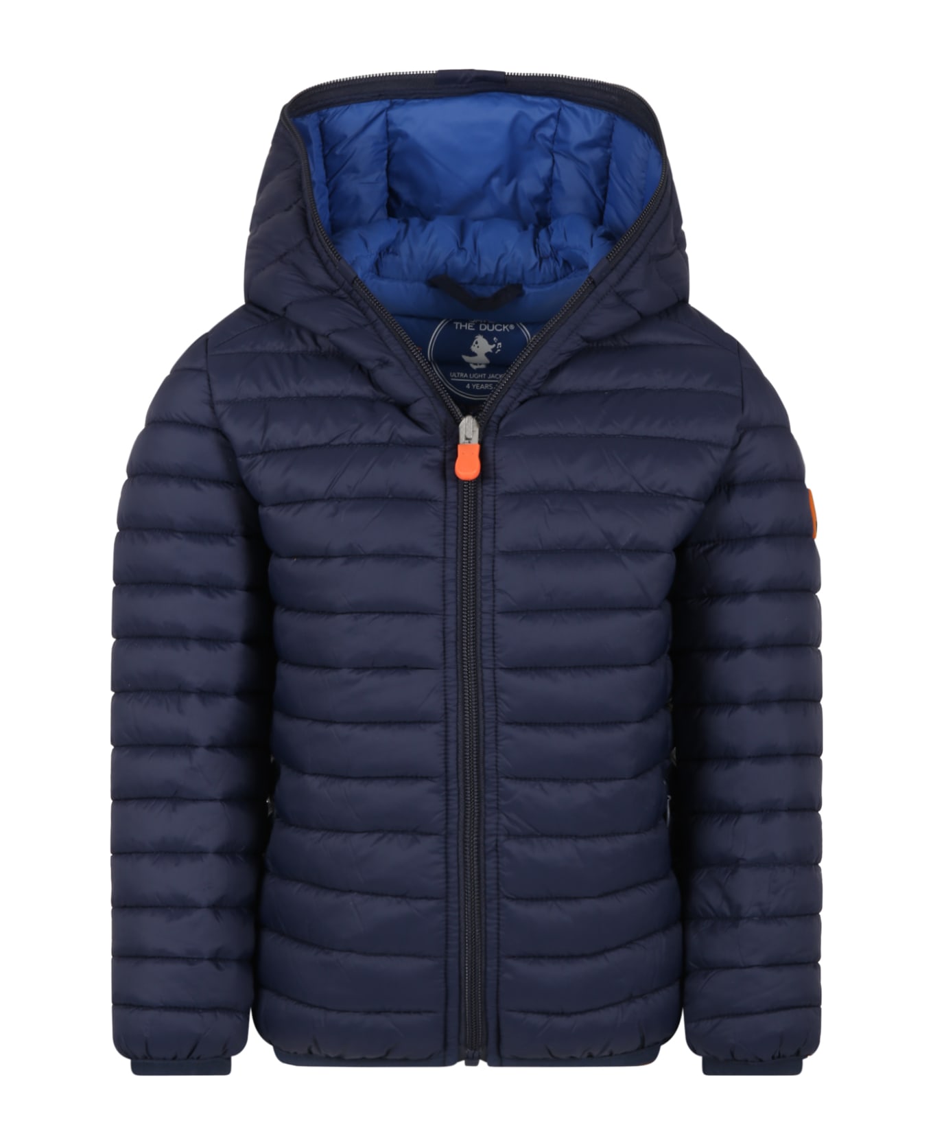 Blue quilted and padded jacket, with long sleeves, hood, zipped closure on the front and side pockets with zip; it is padded with Plumtech, a synthetic thermal wadding, made with respect for the environment and animals. It is embellished with orange iconic rubberized logo applied on the sleeve.