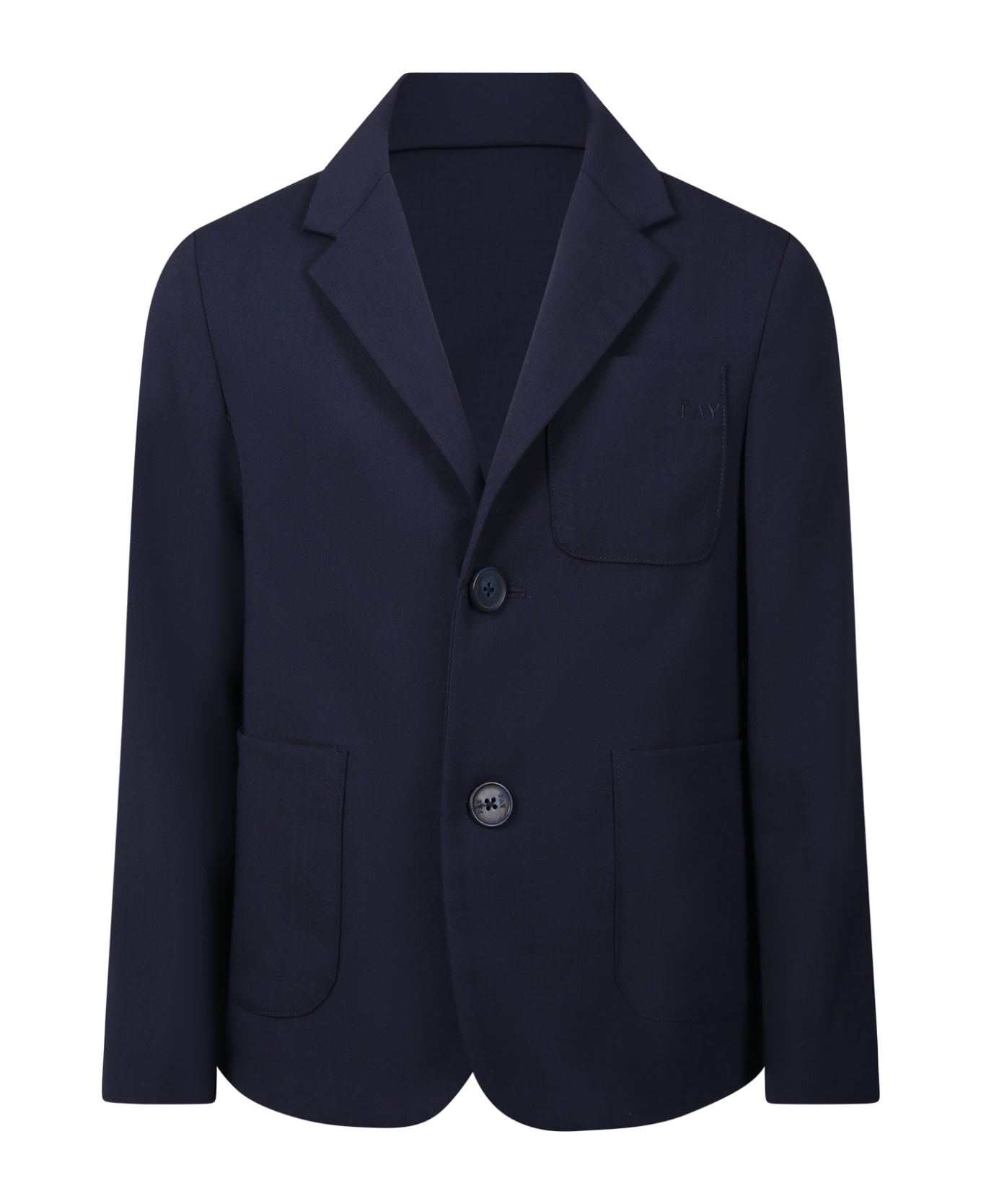 Blue jacket, in wool blend, button closure on the front, collar, side pockets and breast pocket. It is embellished with embroidered logo on the chest.