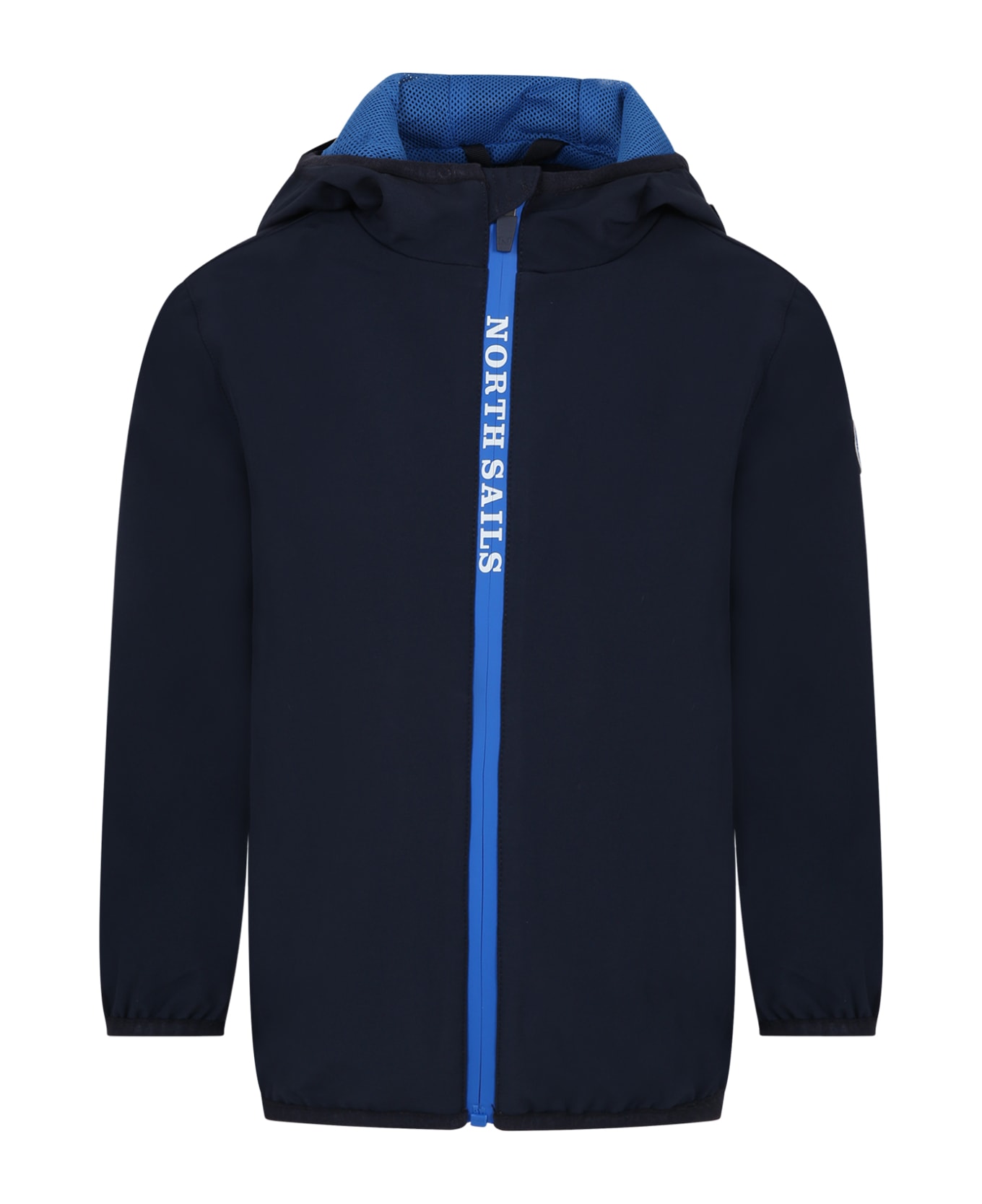 Blue windbreaker, waterproof, with long sleeves, hood with zip pocket, zip closure and side pockets with automatic button. It is embellished with logo on the front and logo patch on the sleeve. This item is made from recycled materials.