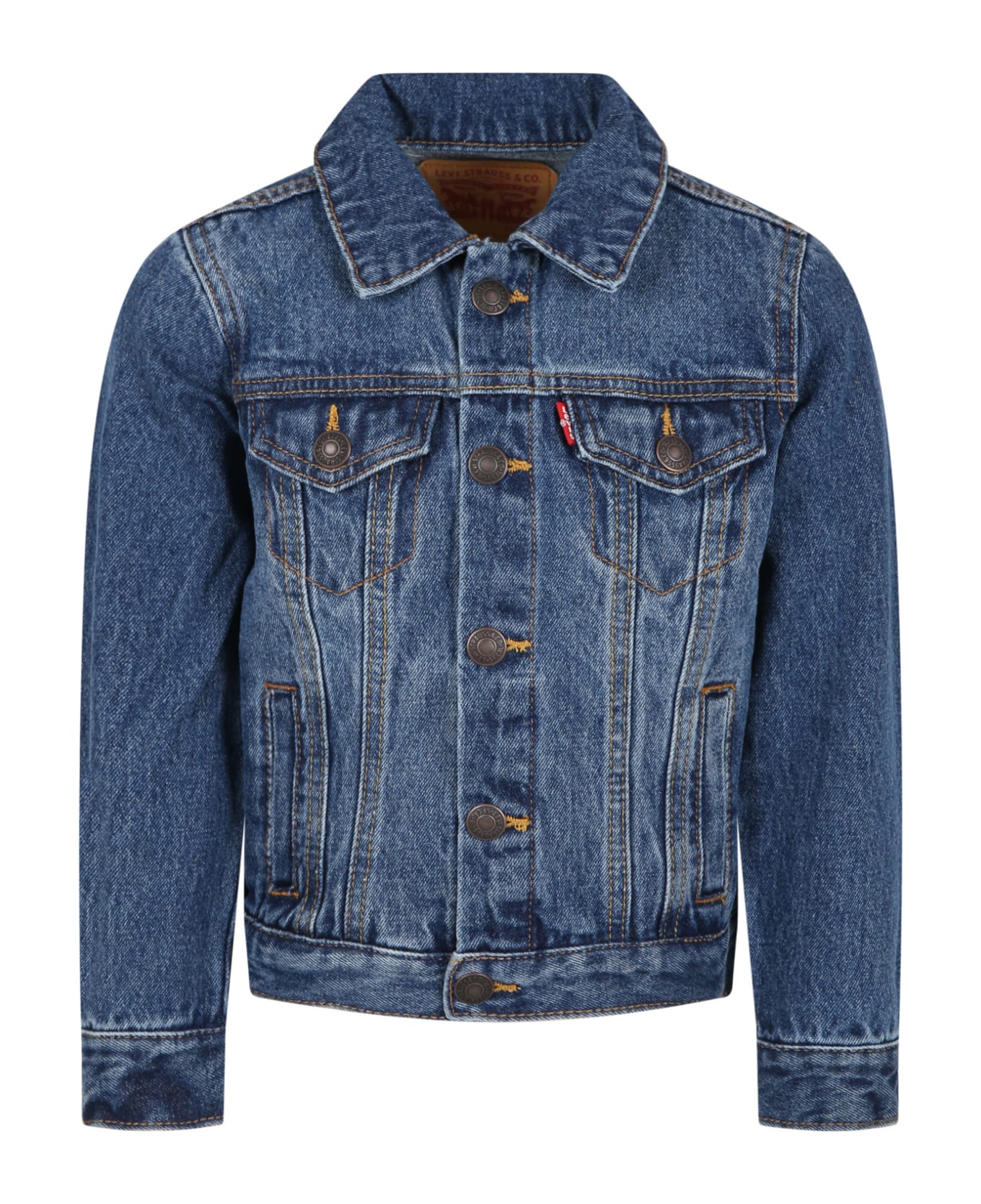Denim blue jacket, with long sleeves, collar, button closure on the front and on the cuffs, side pockets, breast pockets with buttons. It is embellished with logo patch, on the front.