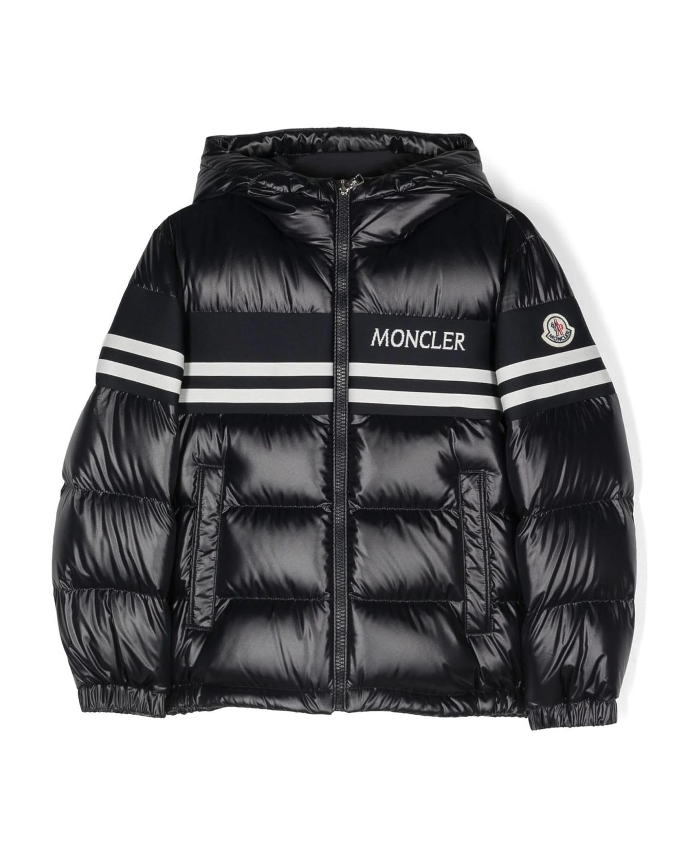 blue polyester jacket recycled polyester down-feather filling classic hood quilted front zip fastening intarsia-knit logo two side welt pockets long sleeves logo patch at the sleeve elasticated cuffs