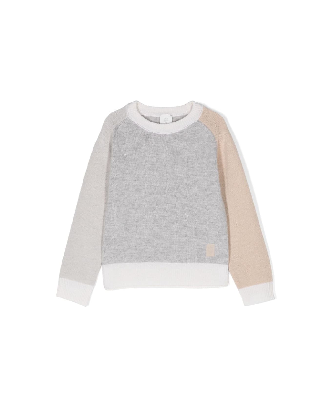 Eleventy Kids sweater in a white, grey and beige wool and cashmere blend with a colour-block design. The garment features a crew neck, long sleeves, ribbed trims and a sewn-on logo patch on the front hem.