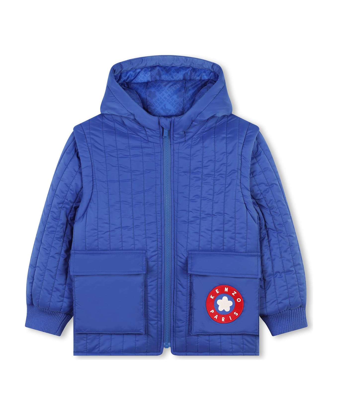 navy blue waterproof padded design hood removable sleeves ribbed hems front flap pockets front logo patch straight hem jacquard logo lining front zip closure Composition 100% polyester