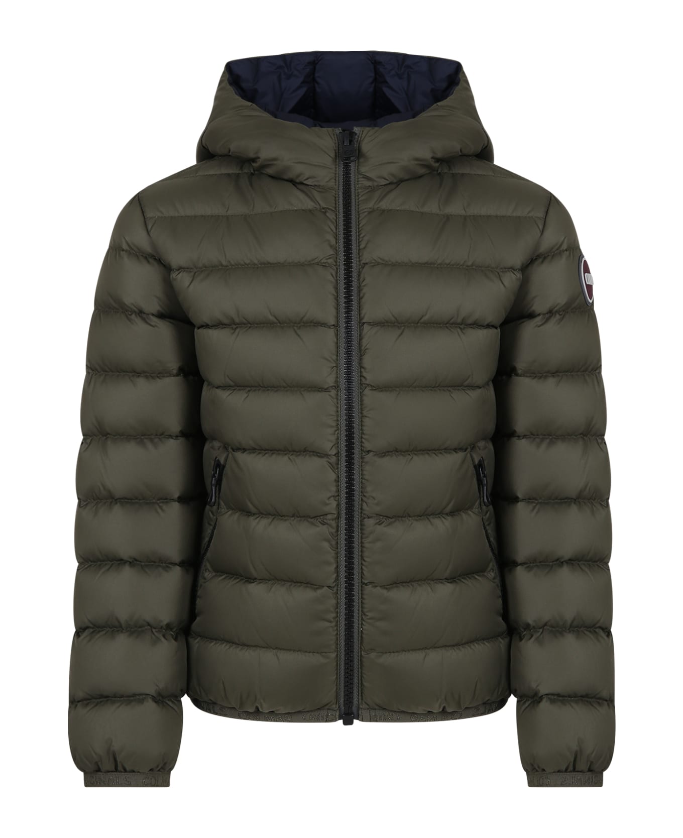 Green down jacket, padded and quilted, hood, with long sleeves with elasticated cuffs, elasticated hem, front zip closure, side pockets with zip. It is embellished with the iconic rubber logo on the sleeve and on the back.