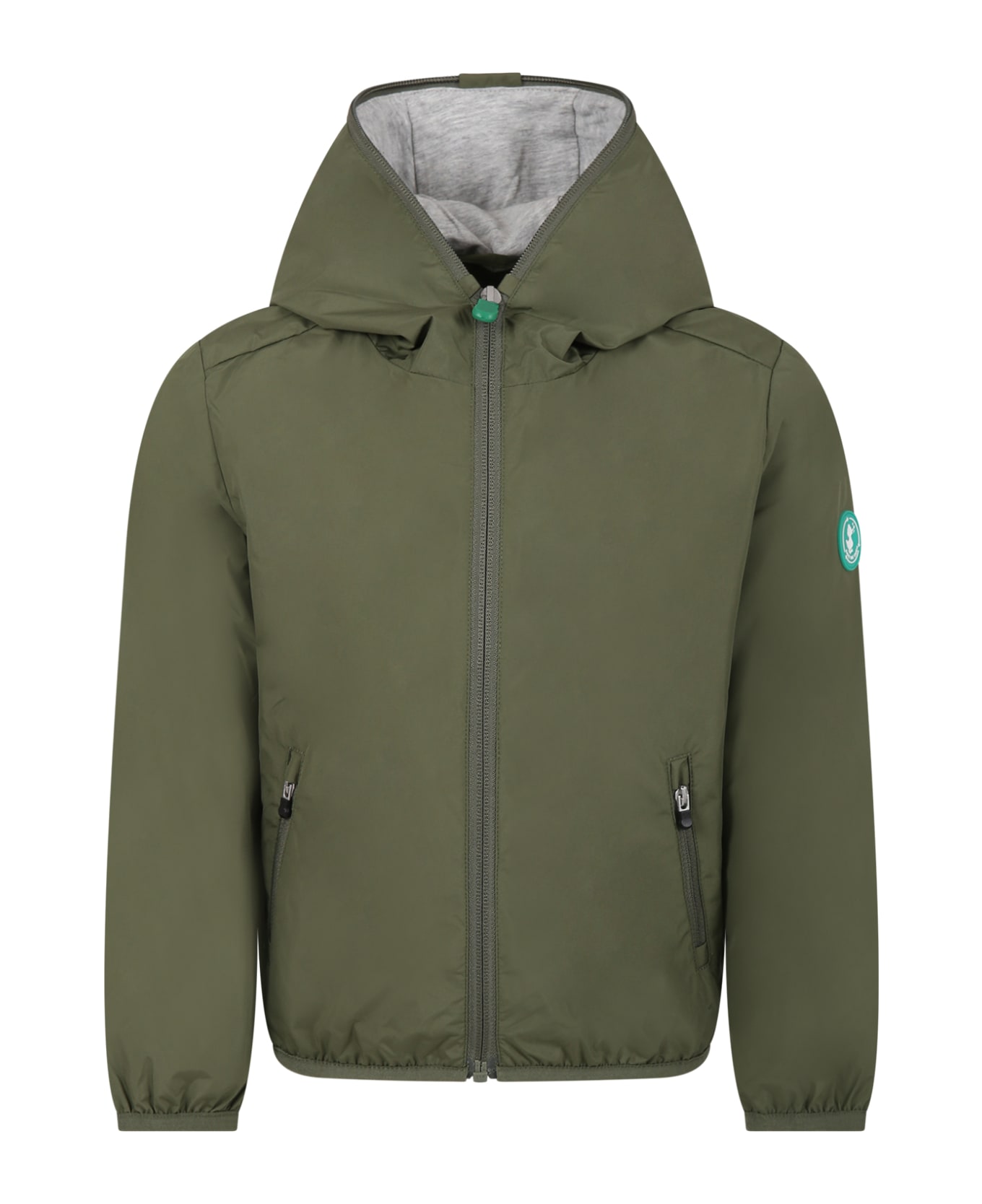 Green windbreaker, in recycled polyester, in technical fabric, with long sleeves, hood, zip closure on the front, side pockets with zip. It is embellished with rubberized logo on the sleeve.