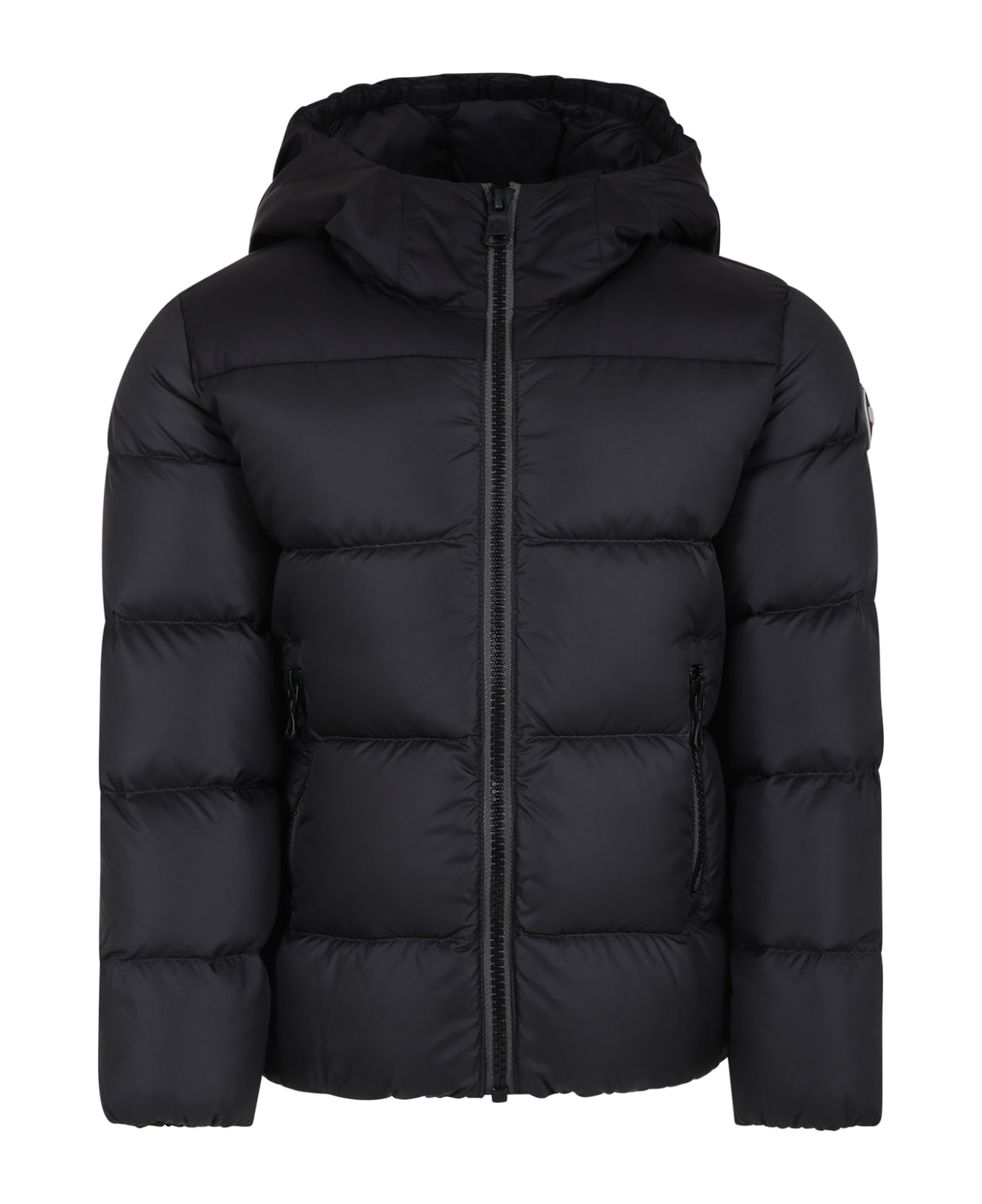 Grey down jacket, padded and quilted, hood, with long sleeves with elasticated cuffs, elasticated hem, front zip closure, side pockets with zip. It is embellished with the iconic rubber logo on the sleeve and on the back.