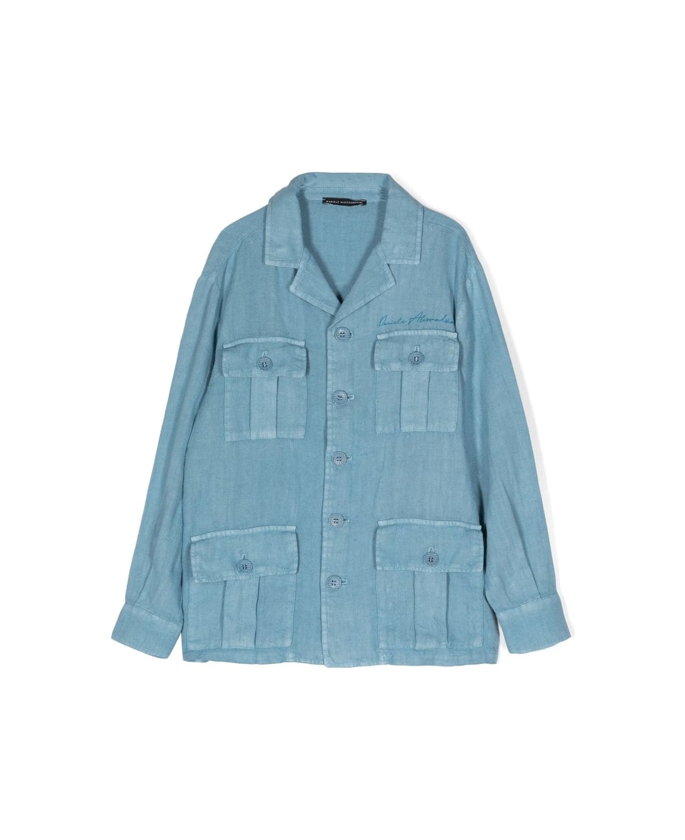 Light blue, linen/linen fiber, embroidered logo on chest, notch lapels, long sleeves, front button fastening, cargo pockets and straight hem. CONSCIOUS: this article contains at least 50% low impact materials, certified or widely recognized as having a low environmental impact. Origin: Italy Composition 100% linen