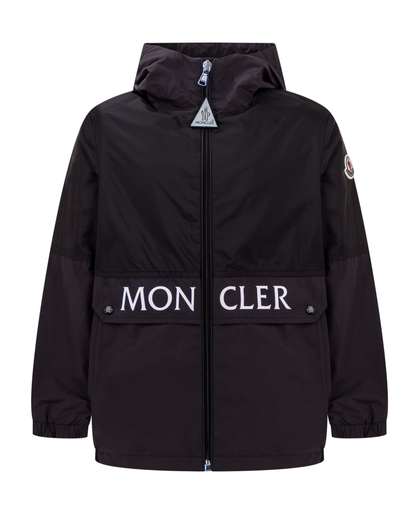 Black long-sleeved jacket with hood. High collar. Four front pockets with logo. Zipper closure on front. Logo patch on sleeve.