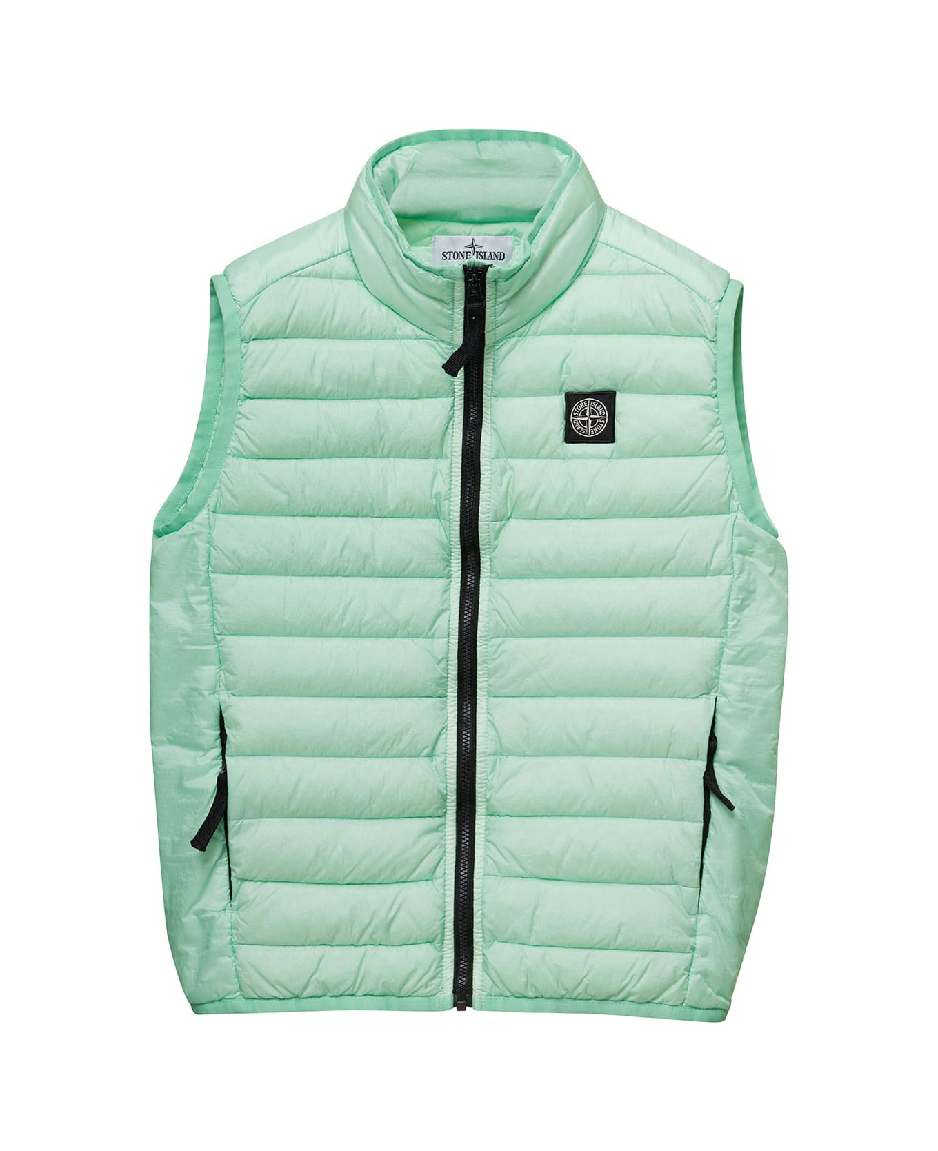 Down jacket Crewneck Sleeveless Logo patch on the front Front zip fastening Two vertical zip fastening pockets on the front Tonal stitching Straight hem Light blue Regular fit