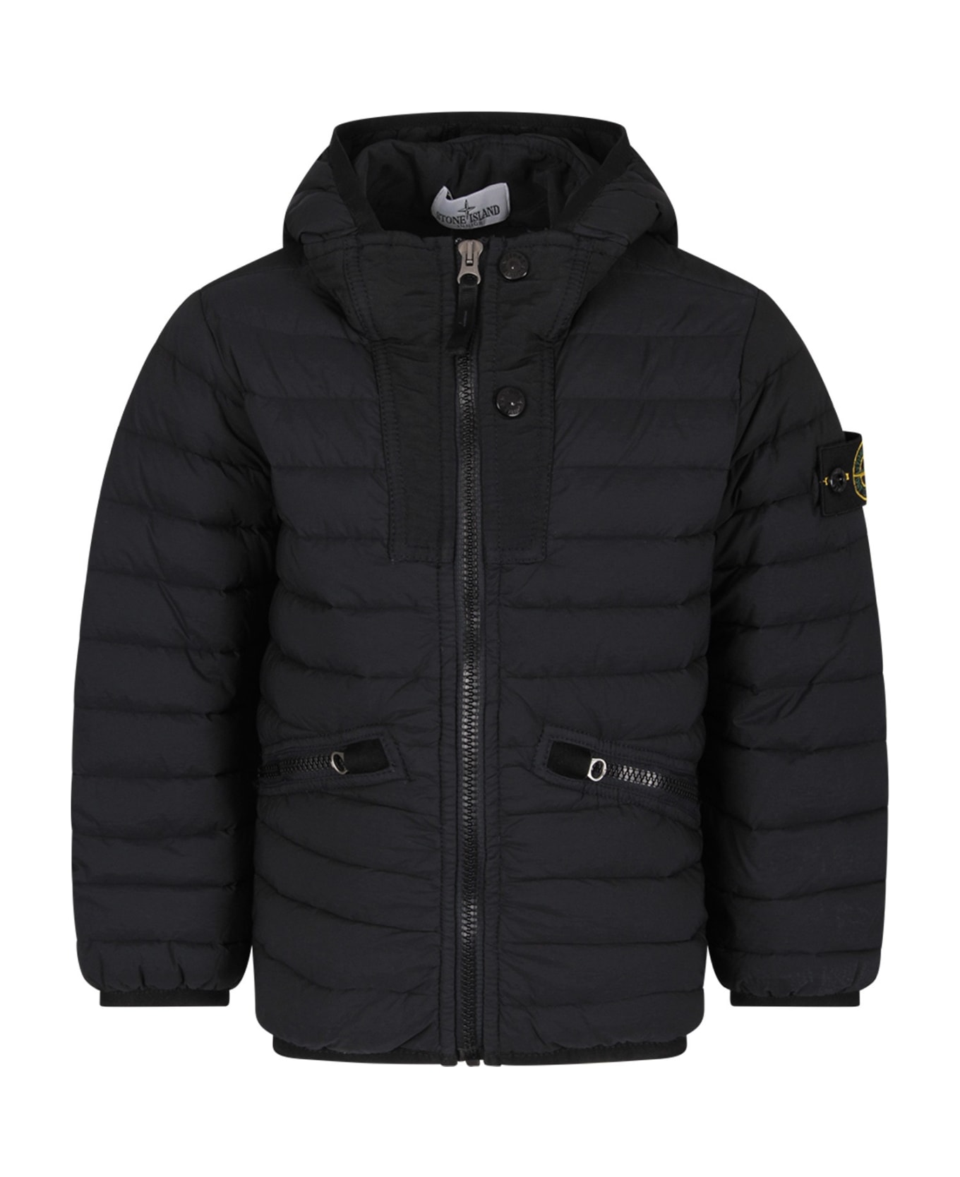 Blue quilted jacket with hood, long sleeves, frontall zipped pockets and closure with zip and press-studs, on the front. It is embellished with iconic patch, on the sleeve.