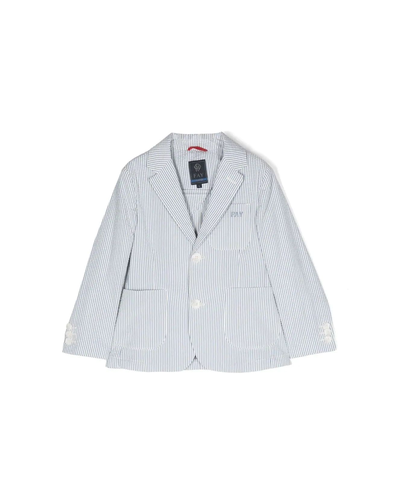 Light blue, cloud white, cotton blend, pinstripe print, front button closure, notch lapels, long sleeves and side patch pockets. Composition Lining: Viscose 100% Outer: 100% Cotton 100% polyester