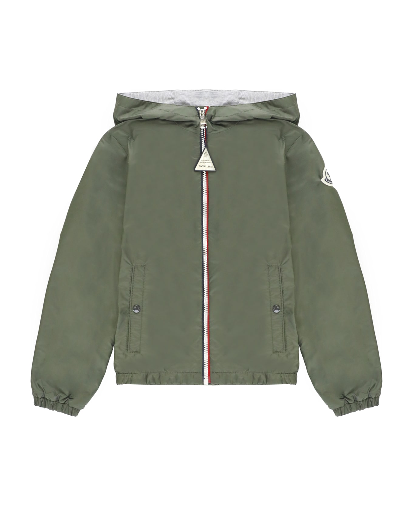 - Green Moncler Enfant down jacket for boy - Hood - Long sleeves with elastic at hem - Contrasting colour loged patch at left sleeve - Two side pockets with stud button - Elastic at hem - Front zip fastening - Front contrasting colour bands