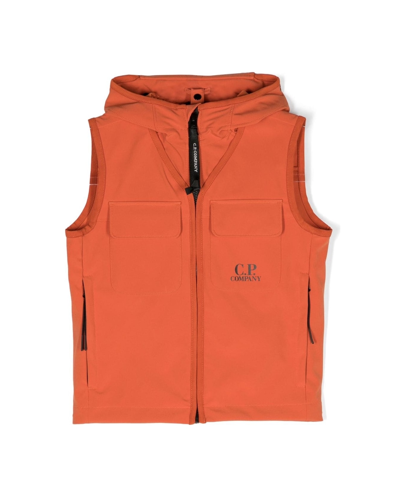 Pumpkin orange, stretch design, front logo print, hooded, front zip closure, sleeveless, two chest flap pockets, two side zip pockets and straight hem. Composition Lining: Polyamide 100% Outer: Polyester 92%, Elastane 8%
