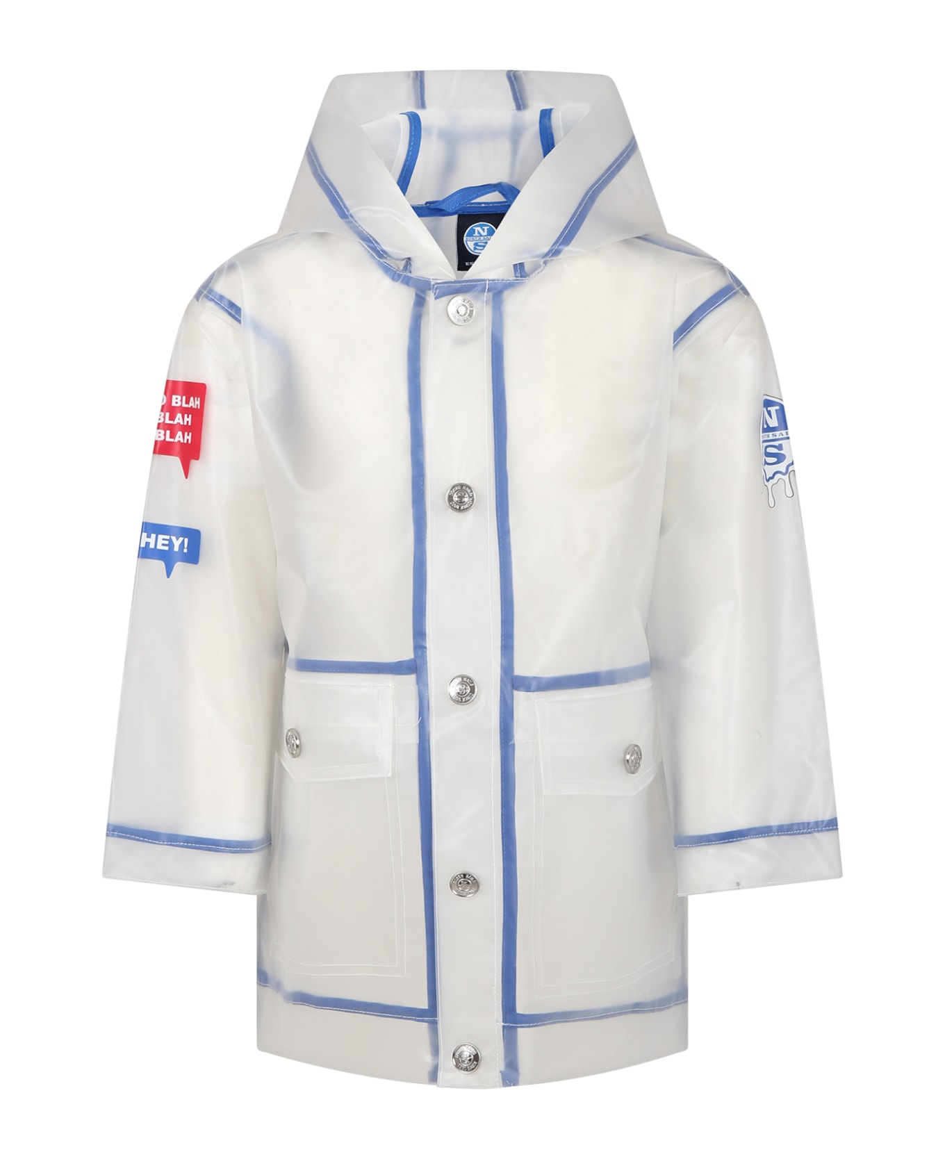 White, waterproof windbreaker in transparent recycled PVC, with hood, closure and side pockets with snap buttons. It is embellished with a maxi print on the back expressing North Sails' commitment to save the planet; SMS prints on left sleeve and logo print on right sleeve.
