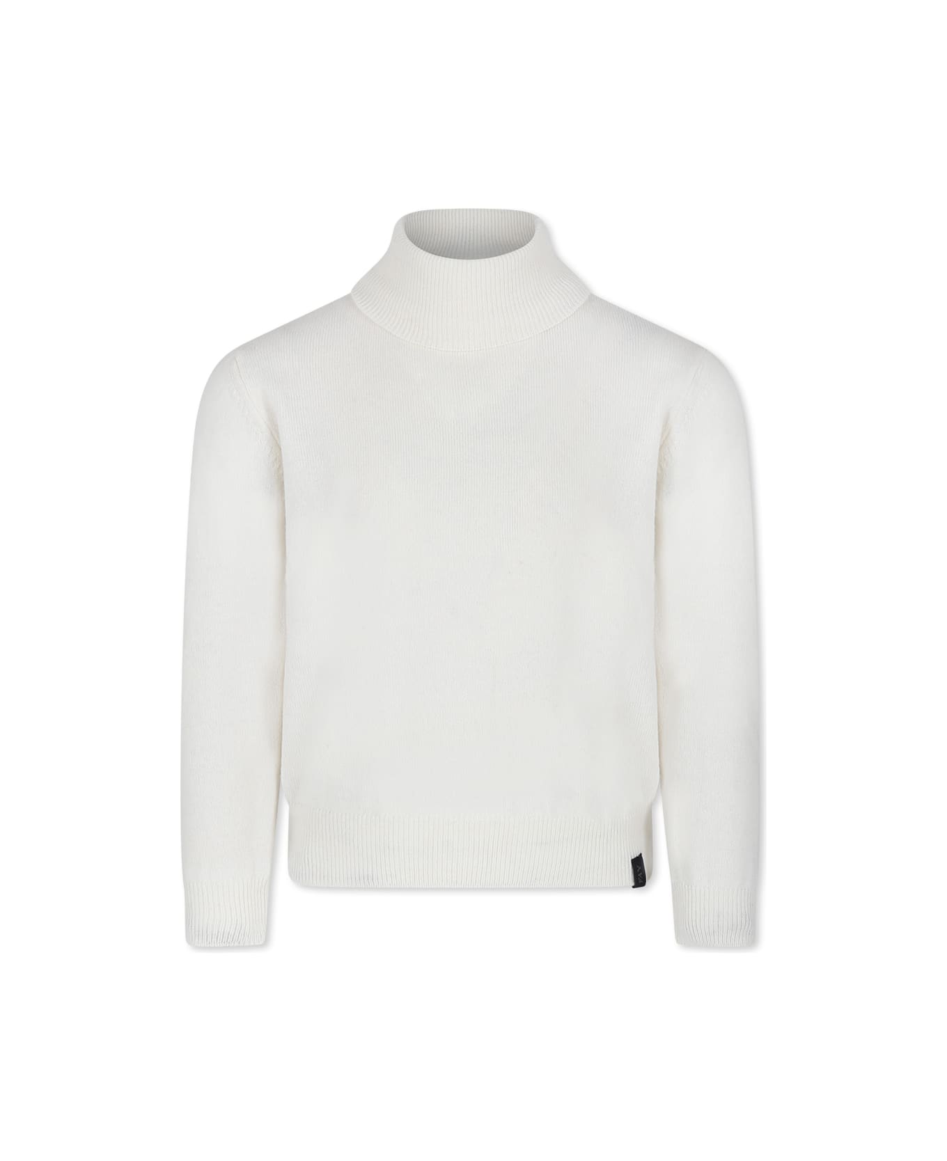 Ivory turtleneck in wool blend, long sleeves, with high collar, cuffs and hem ribbed. It is embellished with a logo patch on the front.