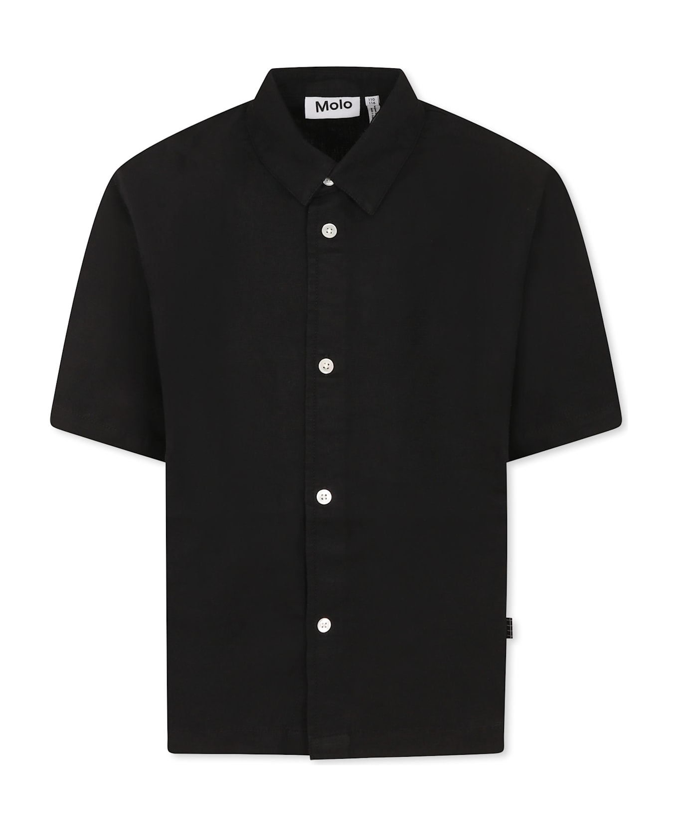 Black cotton and linen shirt with short sleeves, classic collar and button fastening on the front. It is embellished with a logo patch on the side.